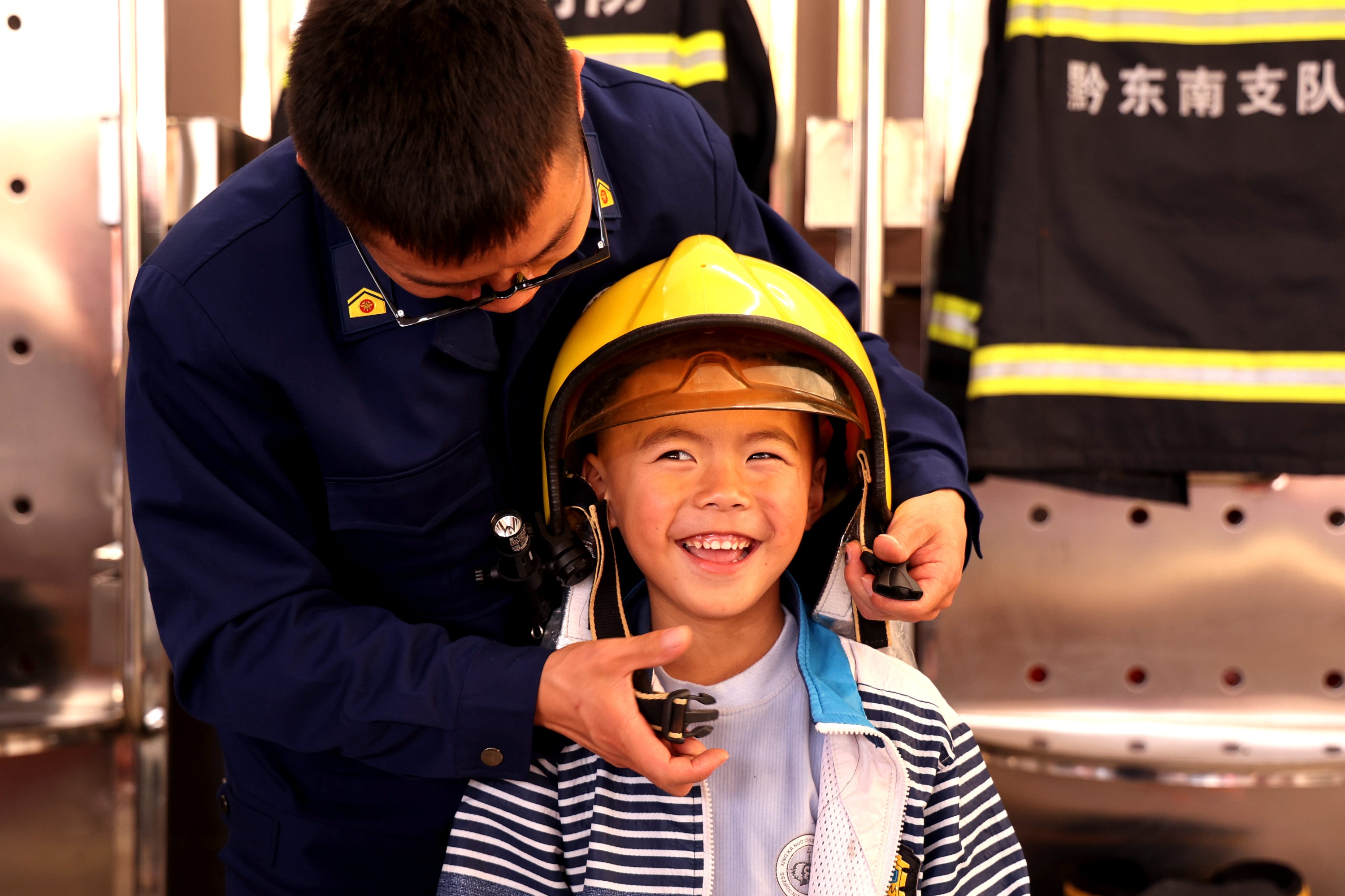 消防员为幼儿园的小朋友佩戴消防头盔 吴昌前 摄