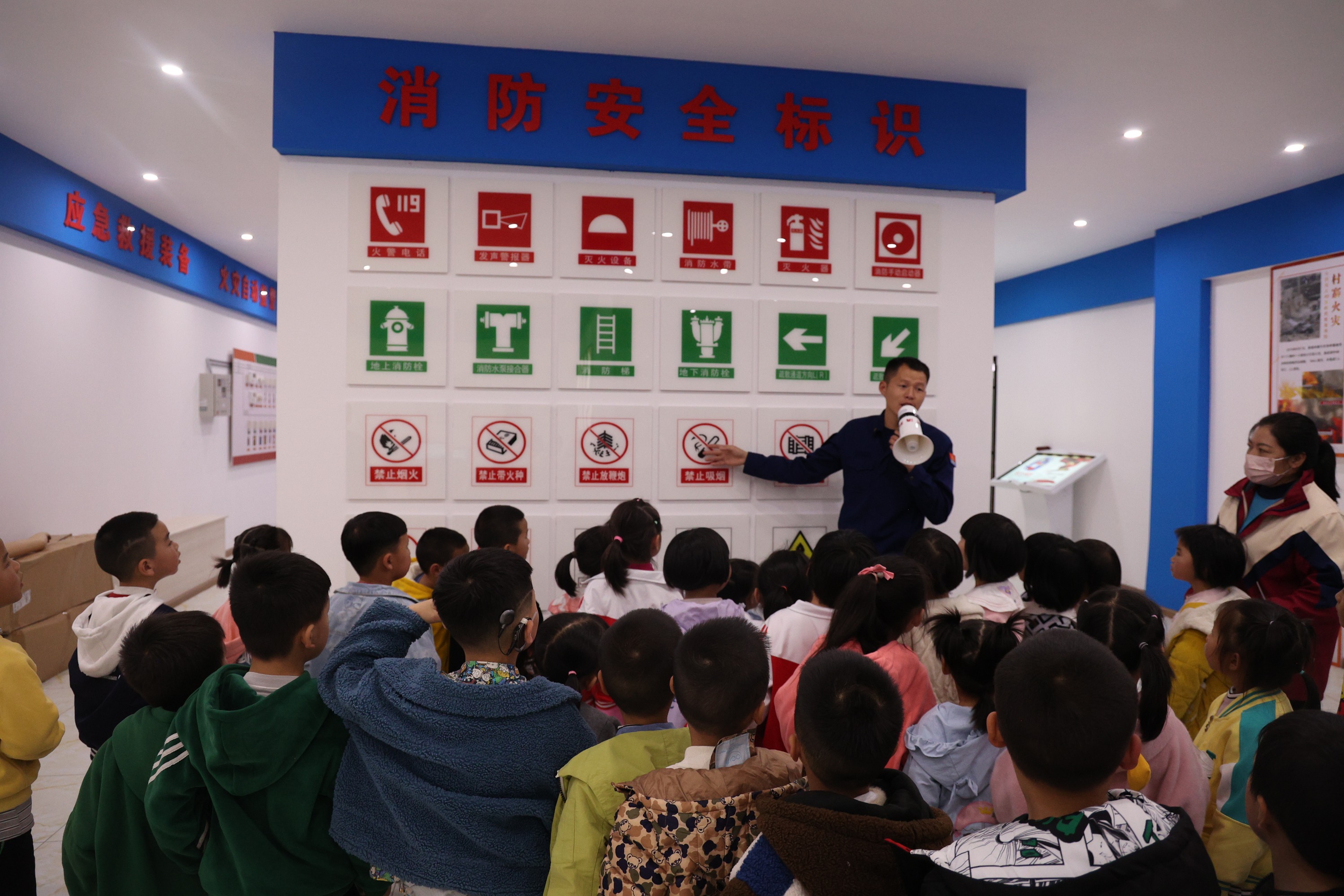 消防员为幼儿园的孩子们普及消防安全标识 吴昌前 摄