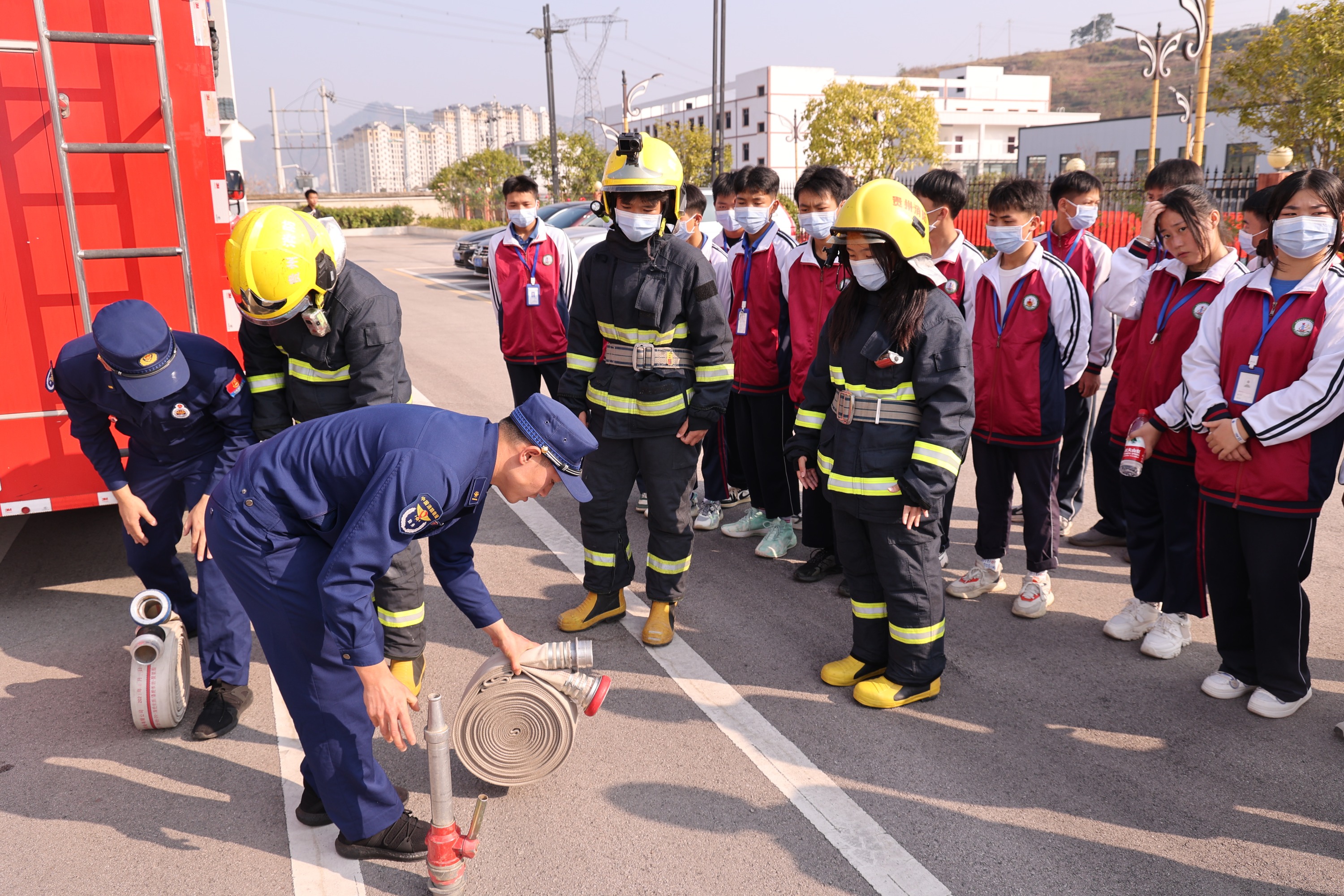 身着消防战斗服的学生正在学习铺设水带和安装水枪 张楠琪 摄