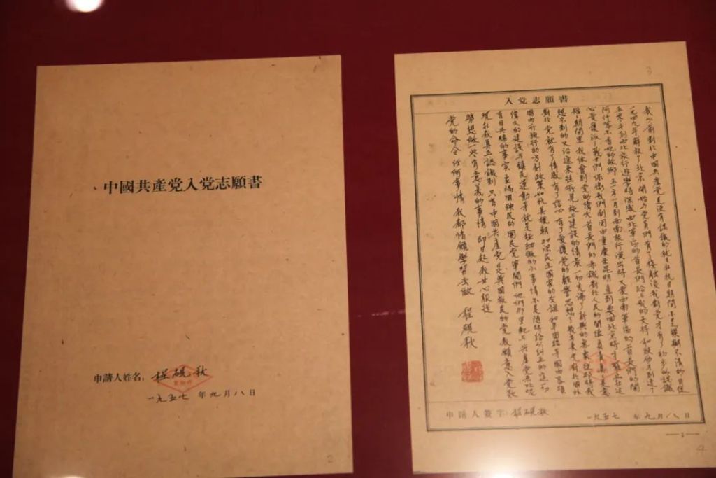 程砚秋(1904—1958),京剧表演艺术家,曾任中国戏协理事会主席团委员、中国戏曲研究院副院长。1957年9月8日向党组织递交入党志愿书,1957年11月加入中国共产党。