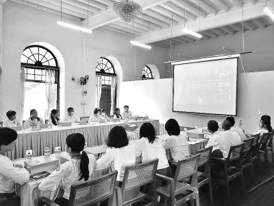 4月20日,仰光市拉达基础教育第二中学的多功能厅里,来自仰光市四所高中的20名学生,身着白绿校服,应邀参加了"天宫对话——神舟十五号航天员乘组与上海合作组织国家青少年问答"线上课堂直播活动。