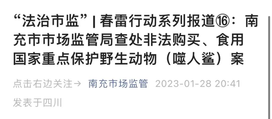 2023年1月,四川南充市市场监督管理局在“春雷行动2023”执法行动中依法查处一起非法购买、食用国家重点保护野生动物(噬人鲨)案,对当事人金某某处罚款12.5万元。