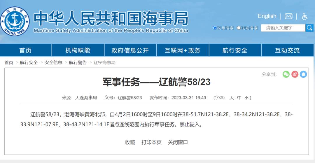 大连海事局发布航行警告,4月2日16时至9日16时,渤海海峡黄海北部部分海域执行军事任务。禁止驶入。