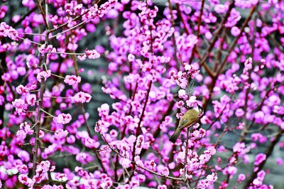 春回大地,万物复苏。鸟儿在花丛中觅食休憩,一派生机勃勃的春日景象。