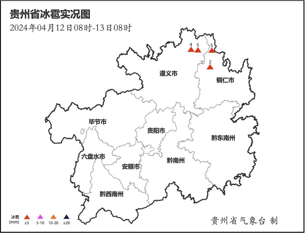 另外道真、沿河、务川、德江等4个县境内出现冰雹,最大直径为务川县5.0毫米;30站出现8级以上大风,最大风速为赫章县兴发24.4米/秒(9级)。