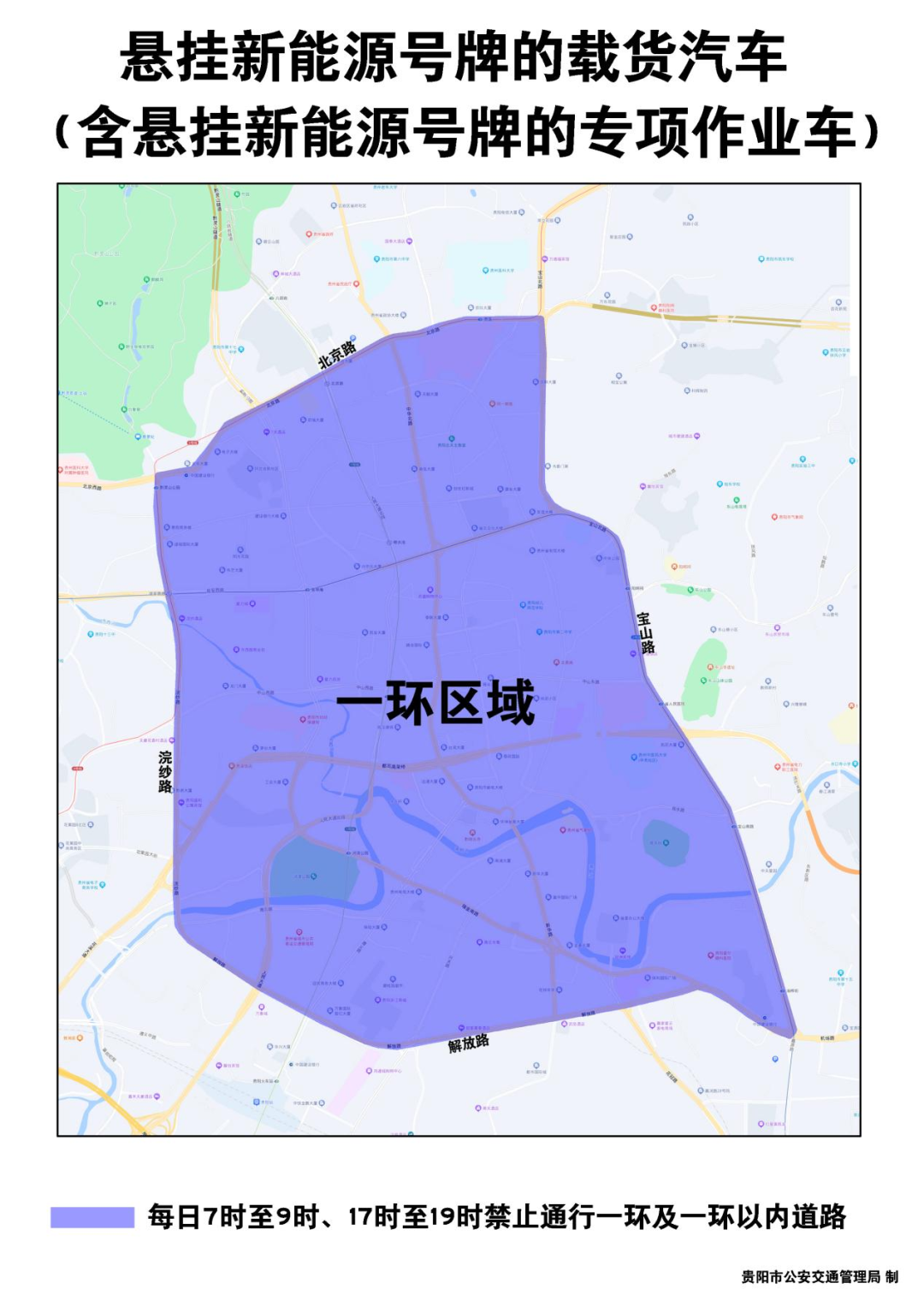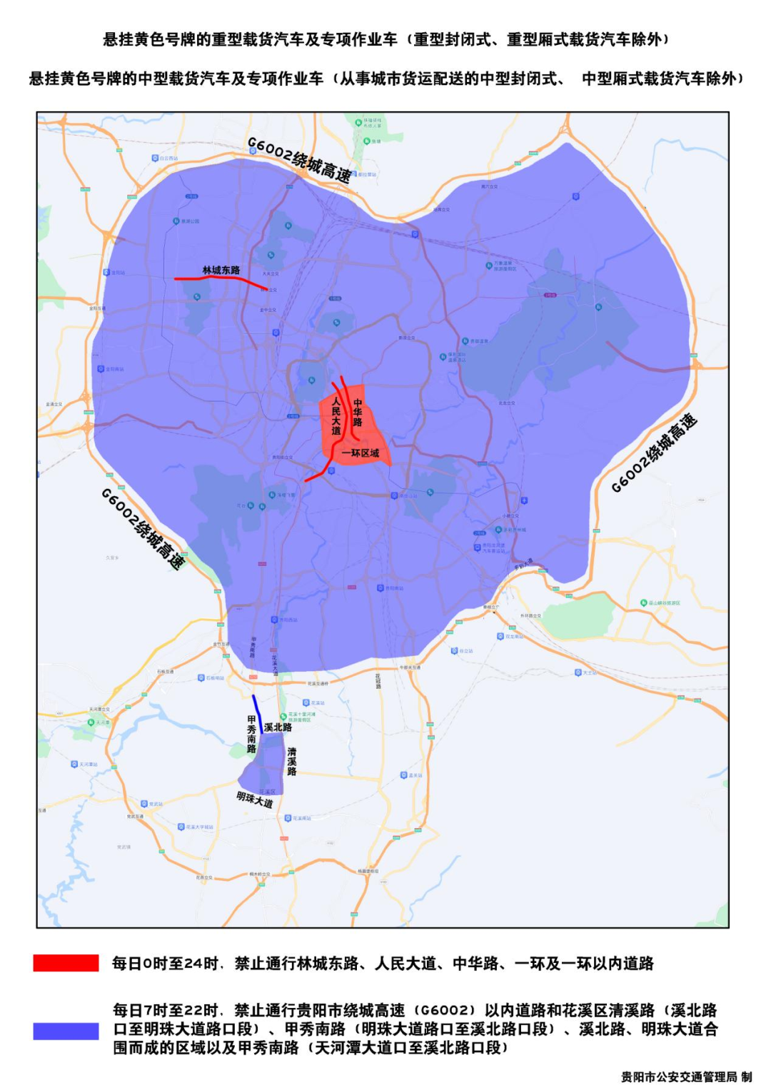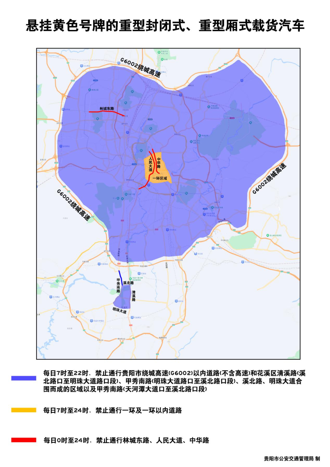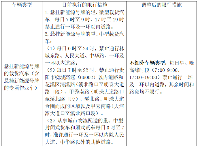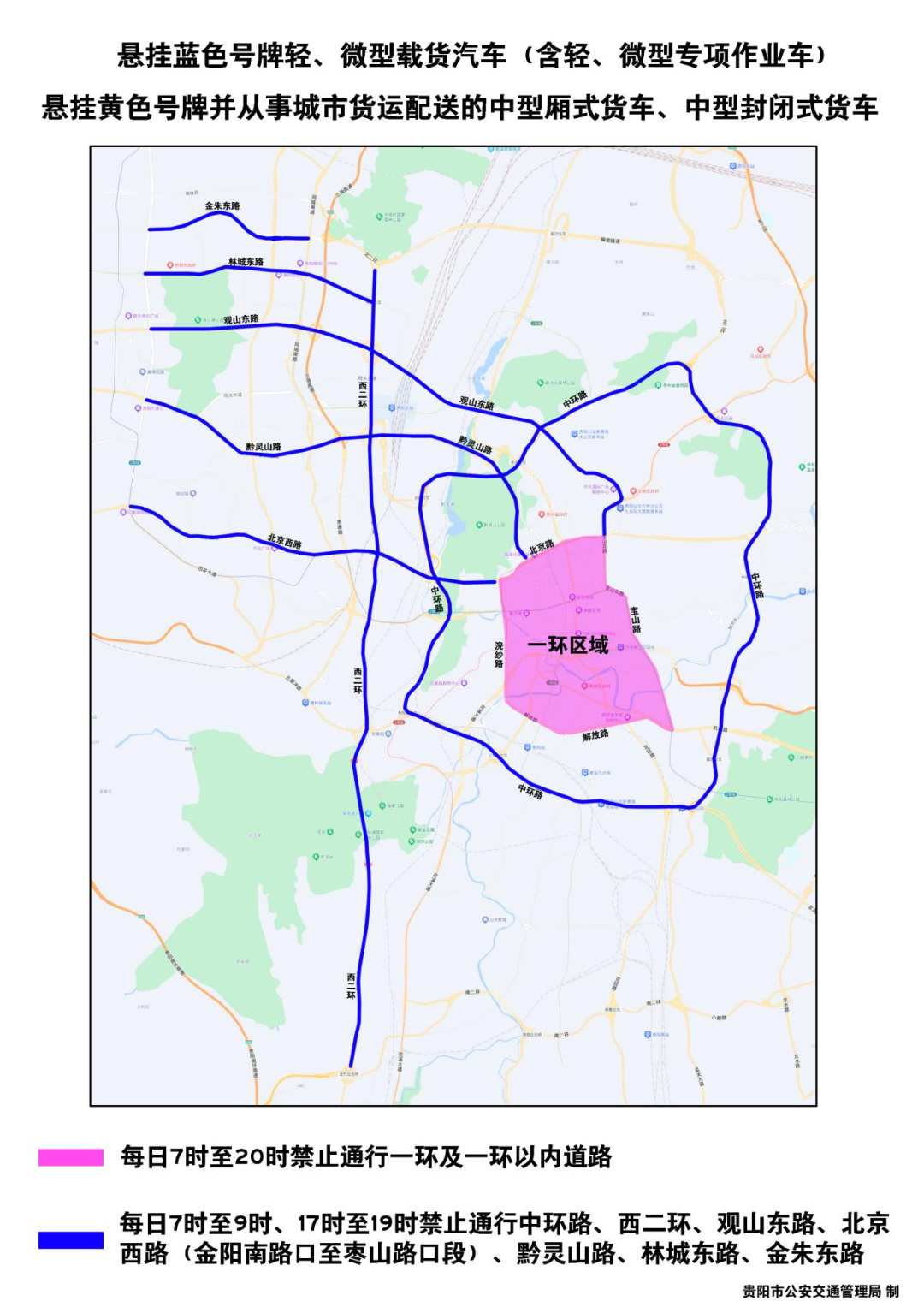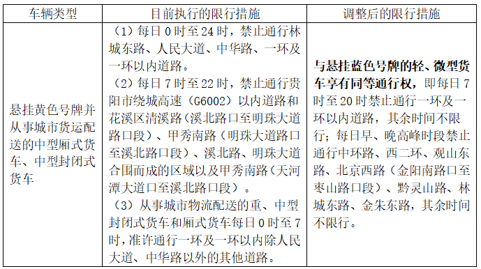 三、悬挂黄色号牌并从事城市货运配送的中型厢式货车、中型封闭式货车限行措施调整为:每日7时至20时禁止通行一环及一环以内道路,其余时间不限行;每日早、晚高峰时段禁止通行中环路、西二环、观山东路、北京西路(金阳南路口至枣山路口段)、黔灵山路、林城东路、金朱东路,其余时间不限行。