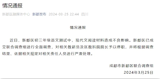 近日,新都区初三年级语文测试中,现代文阅读材料造成不良影响。新都区已成立联合调查组进行全面调查,对相关教研员及区教科院院长予以停职,并将根据调查结果、依据相关规定对相关责任人员进行严肃处理。