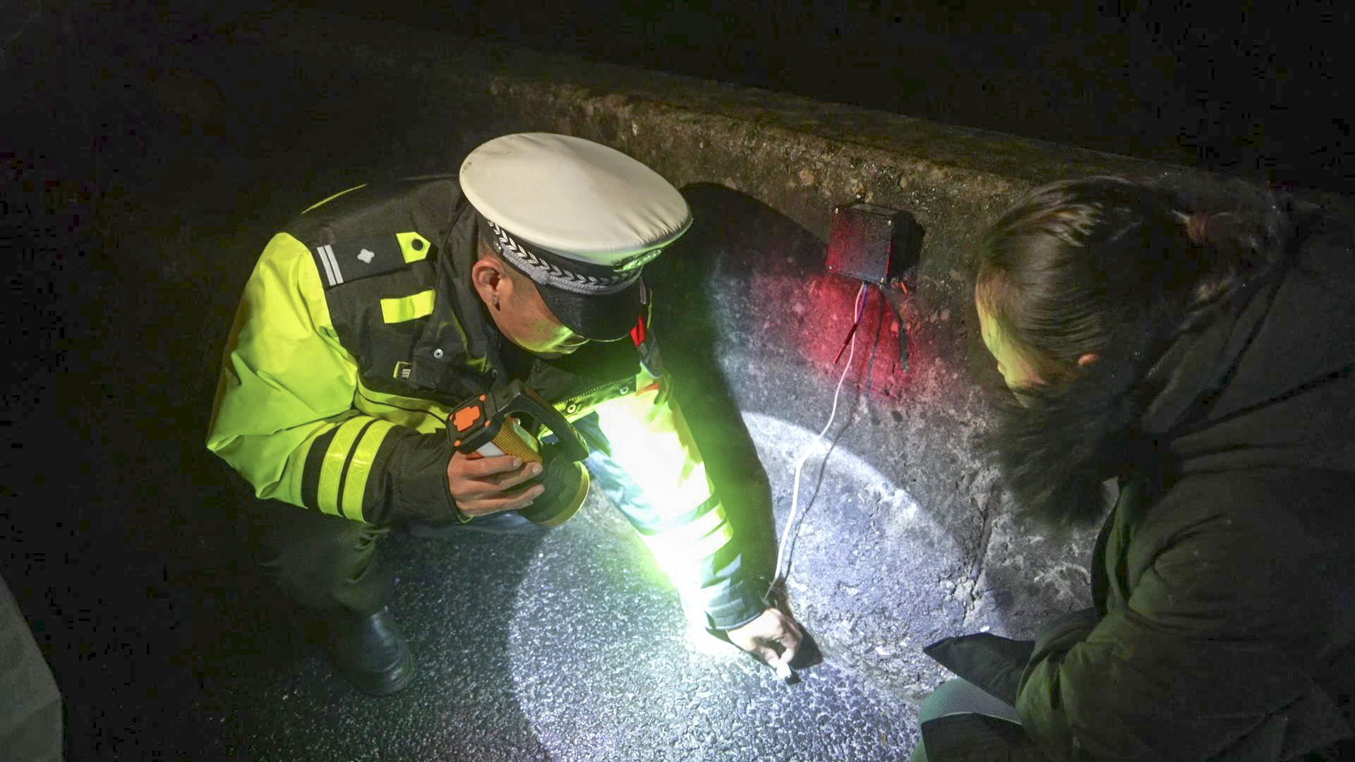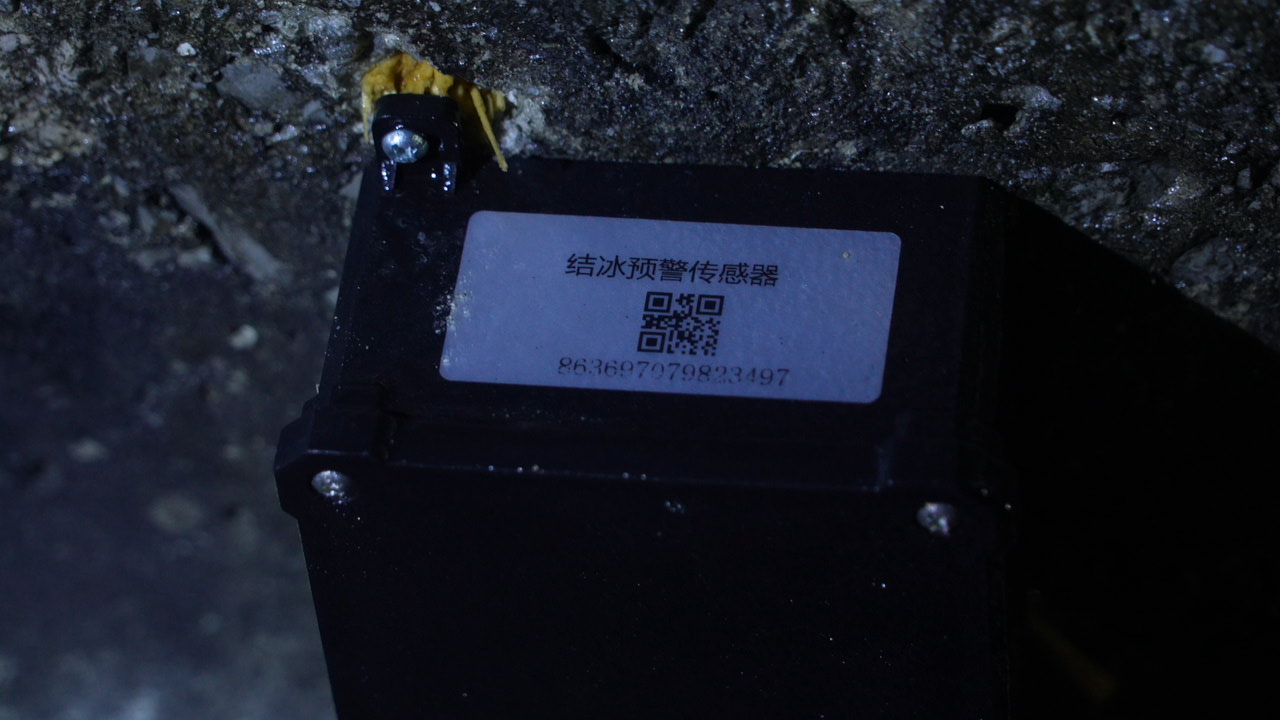 据六盘水市公安交通管理局高速大队刘官中队中队长陆川介绍,道路结冰预警传感器主要有这两根线,蓝色这个空气湿度的感应器,白色的线主要是预警结冰,只要路面凝冻了结冰,这个探头自动会感受到,通过终端上传到我们手机APP上,我们就能实时掌握这个地区的道路环境和是否凝冻的情况。如果结冰预警了,我们就必须采取撒盐除冰措施。