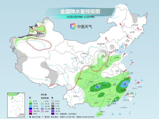 后天,新疆北疆北部和沿天山地区、青海西部和南部、甘肃东南部、西藏东北部和南部等地部分地区有小到中雪或雨夹雪,局地大雪。贵州东北部、湖北南部、湖南中北部、江西北部、浙江西南部、福建西北部等地部分地区有中雨。
