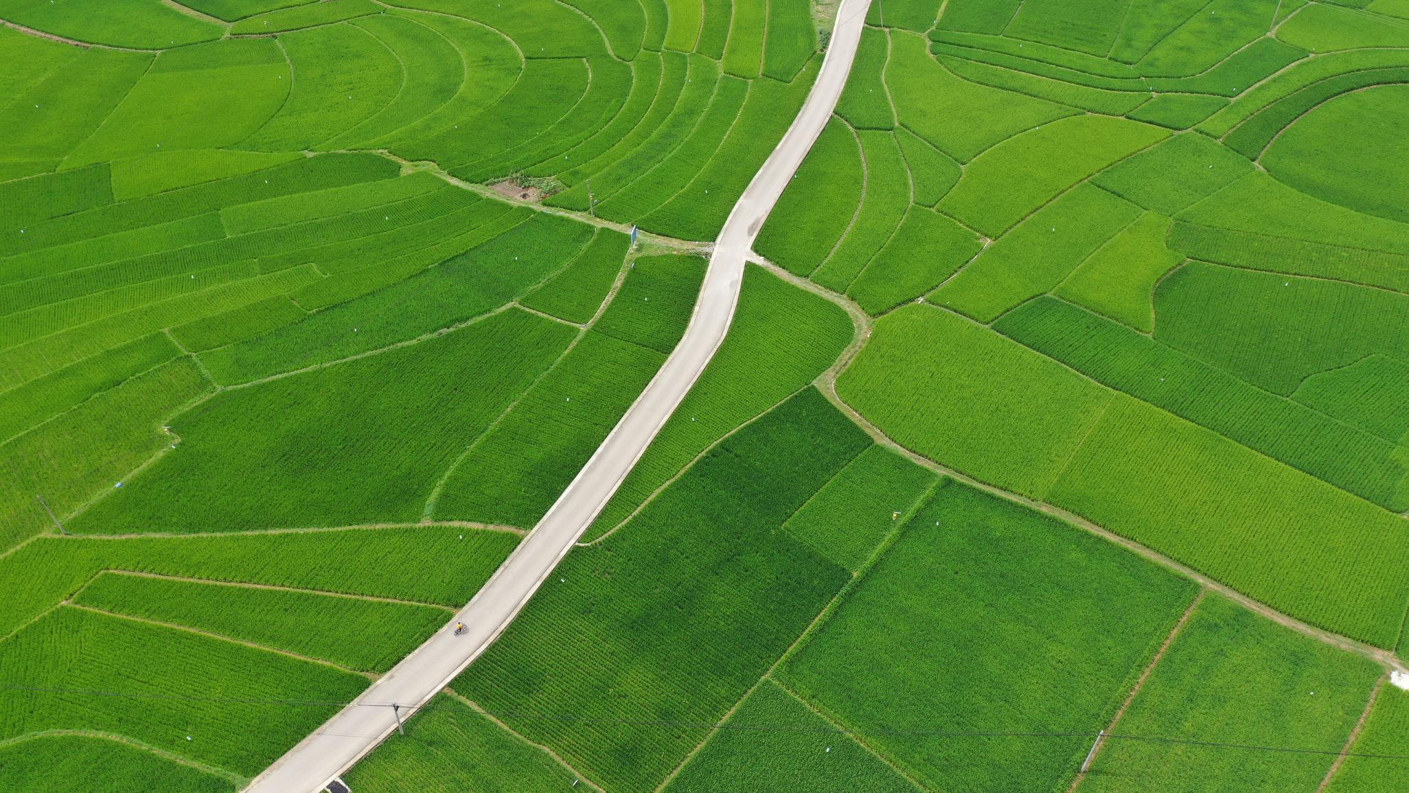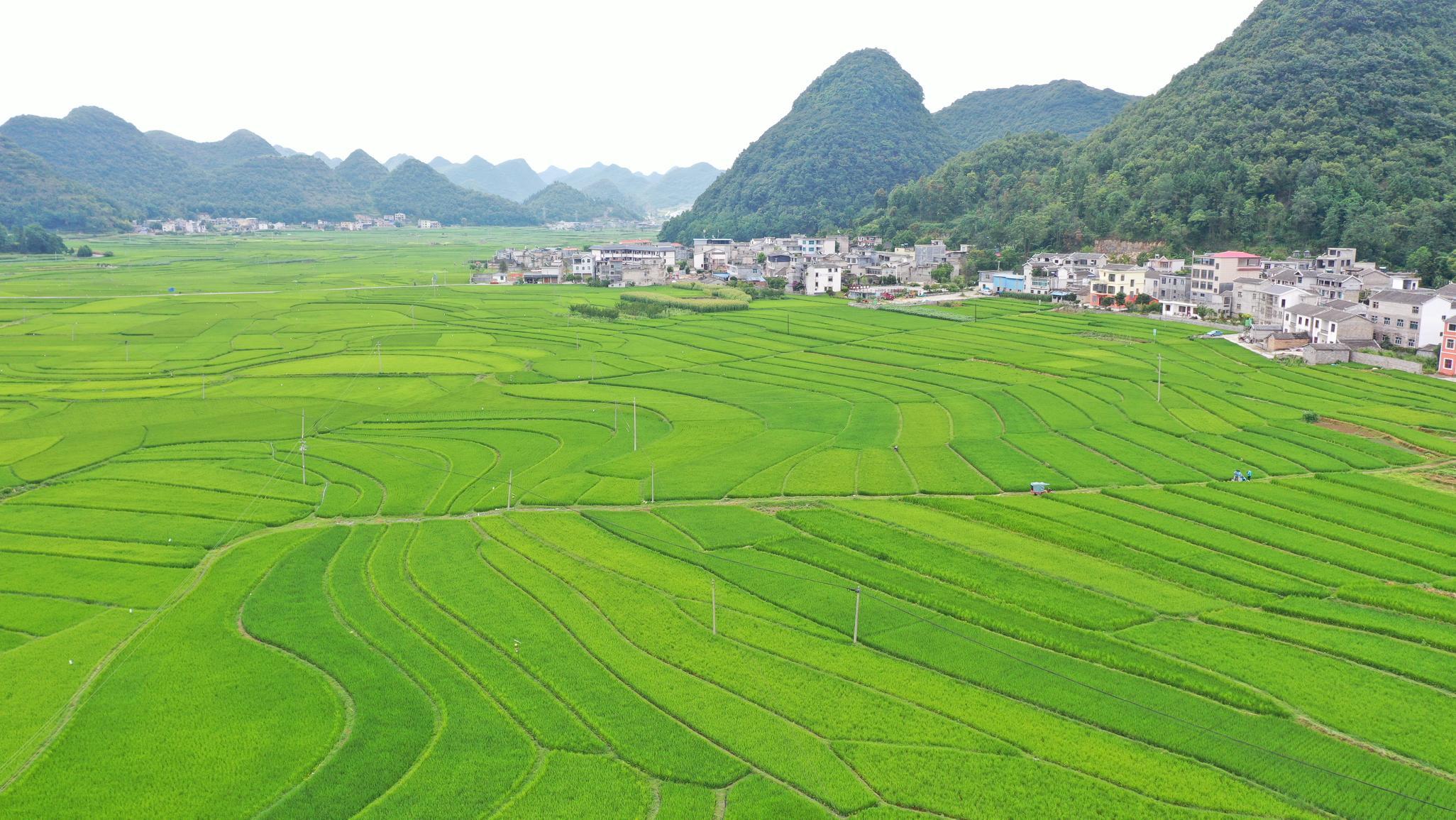 时下,安龙县招堤街道海庄村稻田绿意盎然,田野上飘来阵阵稻香,绿油油的稻穗在地面铺成美景,与远山、村庄、道路交织成一幅美丽的乡村图画。