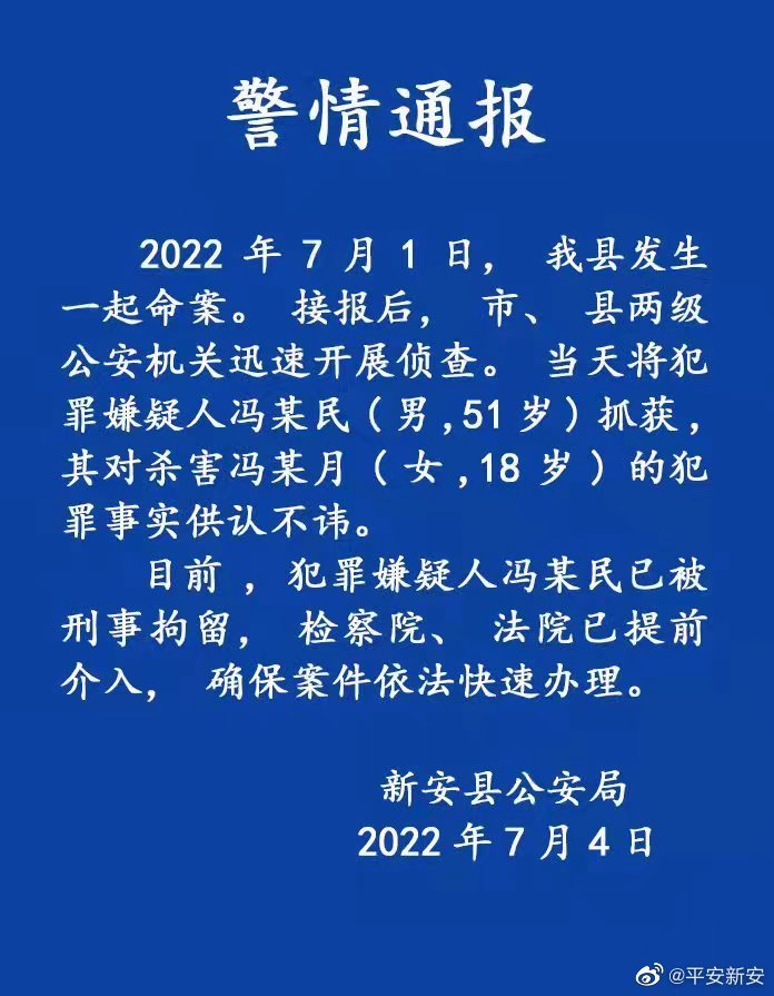 7月4日,平安新安微博发布警情通报:2022年7月1日,我县发生一起命案。接报后,市、县两级公安机关迅速开展侦查。当夭将犯罪嫌疑人冯某民(男,51岁)抓获,其对杀害冯某月(女,18岁)的犯罪事实供认不讳。目前,犯罪嫌疑人冯某民已被刑事拘留,检察院、法院已提前介入,确保案件依法快速办理。