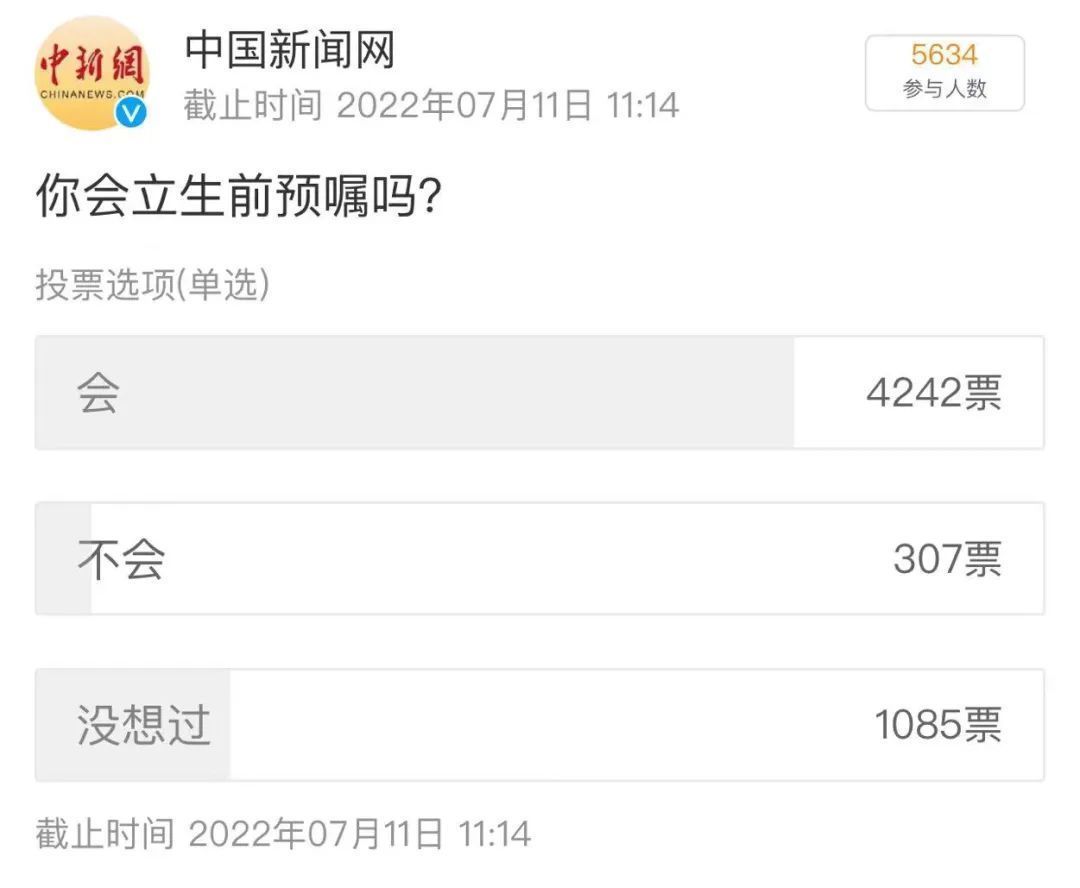 对此,中新网微博也发起了相关投票。对于“你会立生前预嘱吗”的提问,接近四分之三的网友选择“会”。