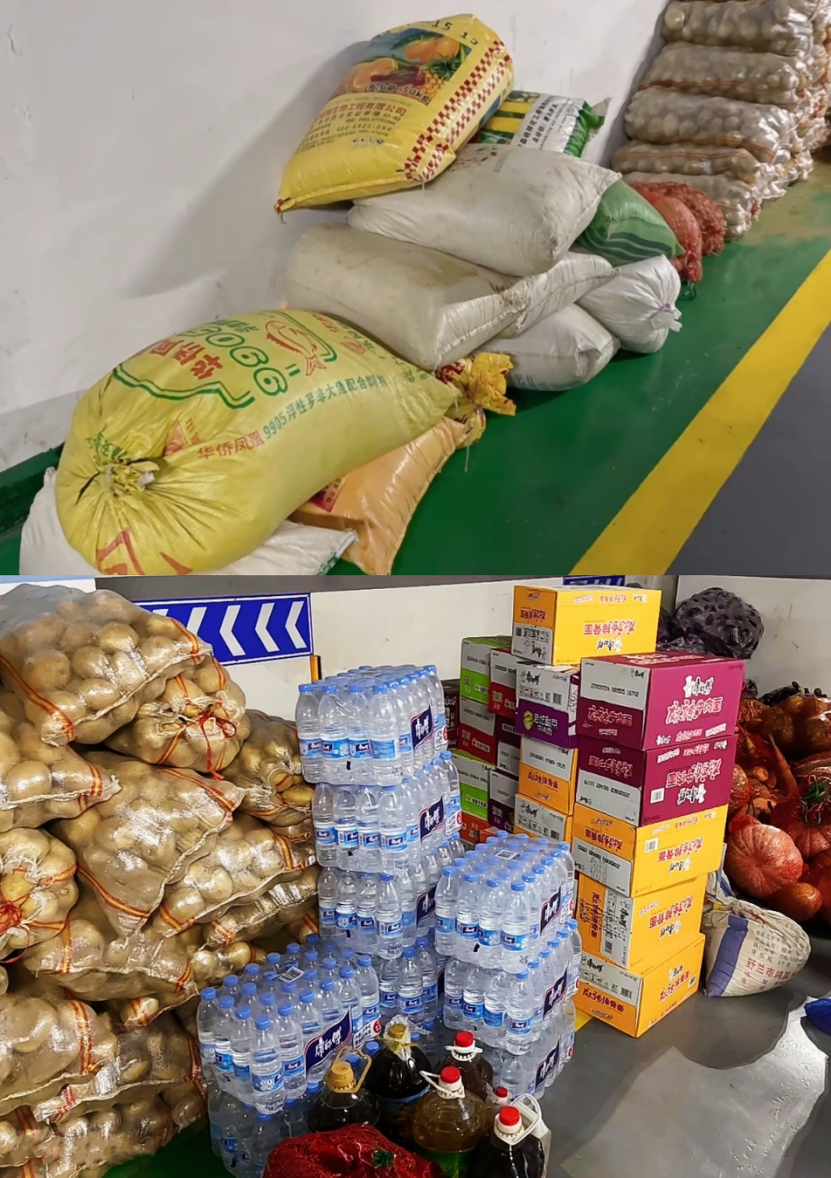 蔬菜瓜果是村民自己地里种的,方便面、矿泉水和菜油等物资是村民捐款买的。