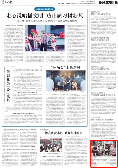 今日(9月15日)《农民日报》刊发图片新闻,关注贵州省桐梓县马鬃苗族乡组建由驻村干部、党员志愿者为主的宣讲队伍,深入农家院坝,从爱党、爱国、爱集体、爱家庭、爱邻居等方面开展“传承好家风”大讲堂活动。