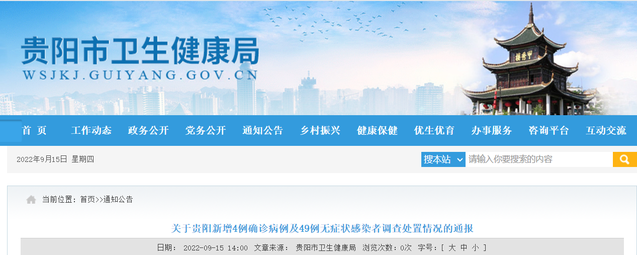 9月14日0时至24时,经复核确诊,贵阳市新增53例阳性病例,4例诊断为新冠肺炎确诊病例,49例诊断为新冠肺炎无症状感染者。