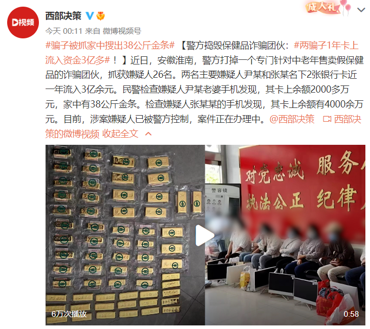 近日,安徽淮南,警方打掉一个专门针对中老年售卖假保健品的诈骗团伙,抓获嫌疑人26名。两名主要嫌疑人尹某和张某名下2张银行卡近一年流入3亿余元。民警检查嫌疑人尹某老婆手机发现,其卡上余额2000多万元,家中有38公斤金条。检查嫌疑人张某某的手机发现,其卡上余额有4000余万元。目前,涉案嫌疑人已被警方控制,案件正在办理中。