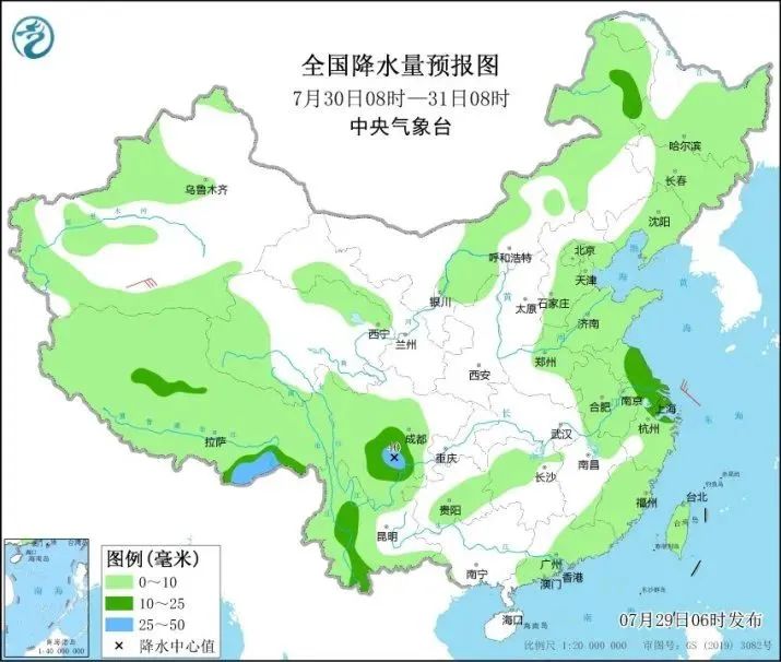 降雨方面:7月29日,辽宁中西部、吉林中部、黑龙江西北部、山东南部、安徽北部、江苏北部、湖南北部、云南东南部、广西西北部等地的部分地区有大雨,其中,辽宁北部、山东南部、江苏北部等地局部地区有暴雨;上述部分地区还将伴有短时强降水、局地有雷暴大风或冰雹等强对流天气。