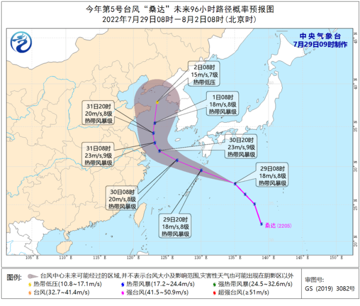 预计,“桑达”将以每小时40公里至50公里的速度向西偏北方向快速移动,强度变化不大,将于29日夜间移入东海海域,30日夜间逐渐转向偏北方向移动,之后强度逐渐减弱。
