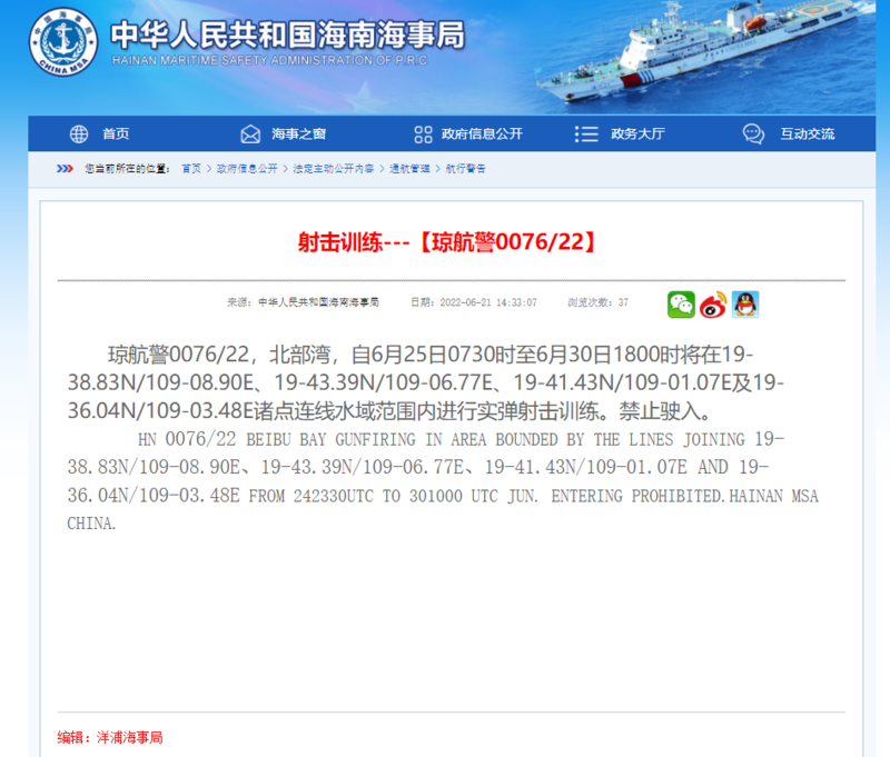 琼航警0076/22,北部湾,自6月25日0730时至6月30日1800时将在19-38.83N/109-08.90E、19-43.39N/109-06.77E、19-41.43N/109-01.07E及19-36.04N/109-03.48E诸点连线水域范围内进行实弹射击训练。禁止驶入。
