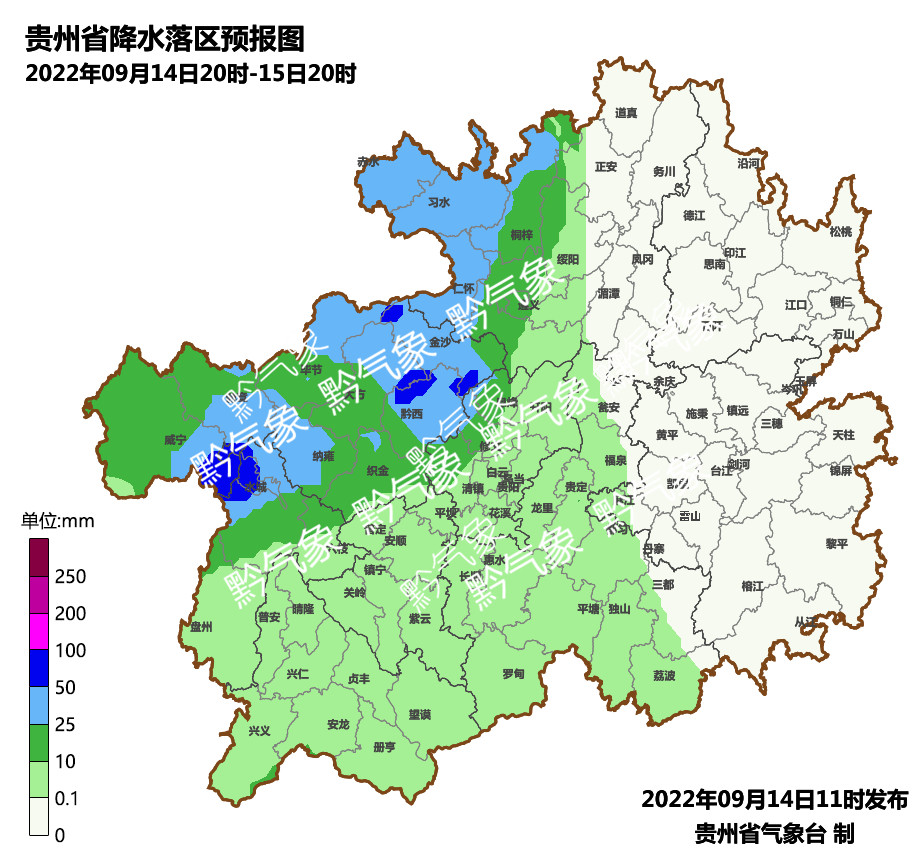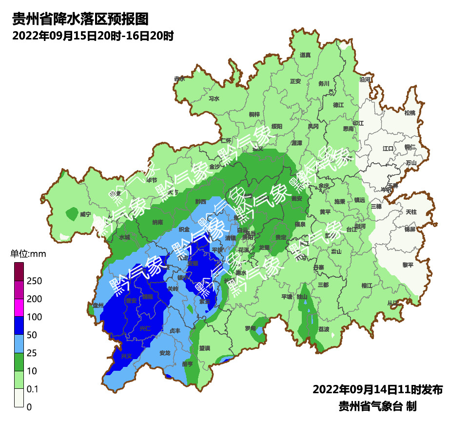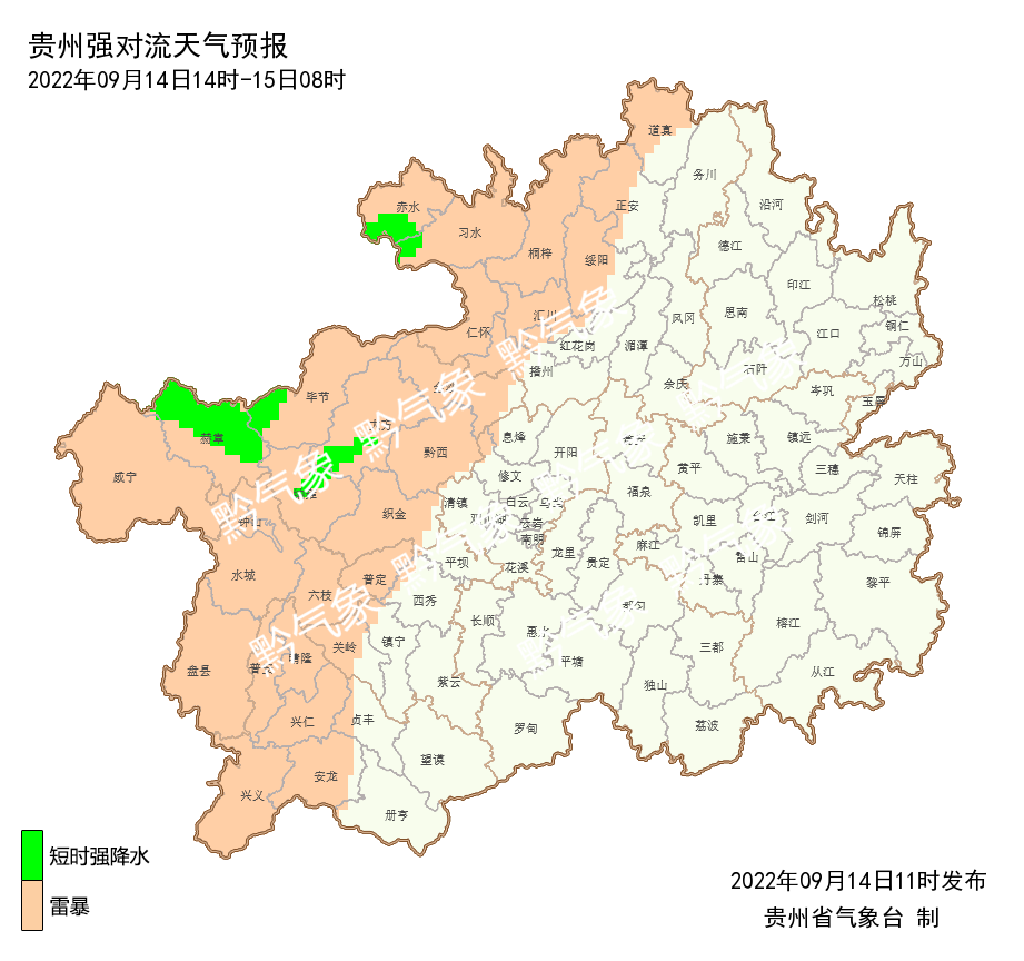 14日夜间至9月15日白天,我省钟山区、水城区地质灾害气象风险较高;息烽县、修文县、六枝特区、盘州市、桐梓县、习水县、赤水市、仁怀市、毕节市、兴义市、兴仁市、普安县、晴隆县、安龙县地质灾害气象有一定风险。