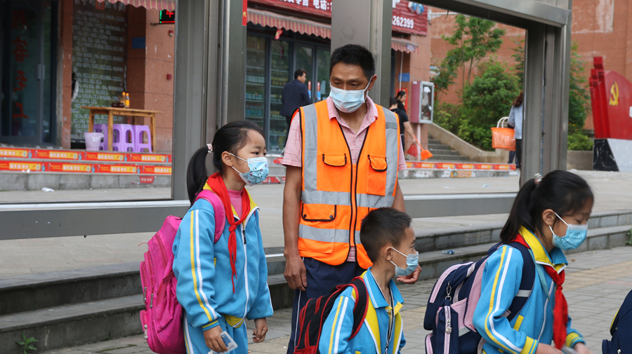 初夏微凉,早上六点,贵州省岑巩县大坪同心社区的公交站台旁,来自社区的600余小学生整齐划一地排起了长龙,韩芝江正在引导学生做好安全防护、安全文明乘车,待学生们全部安全有序上车后,才放心离开。这样的暖心守护,韩芝江和队友们已经坚持了一年多。