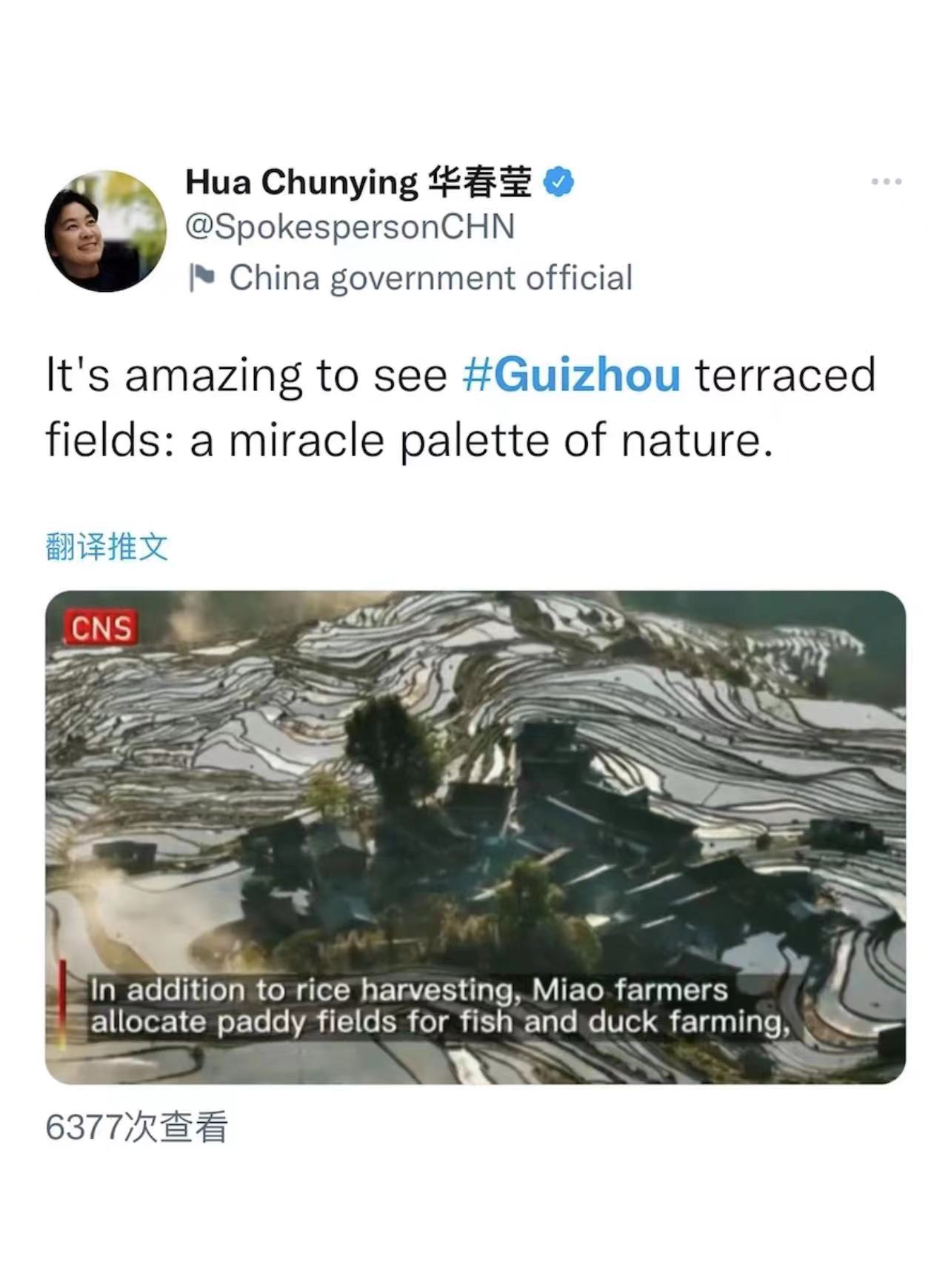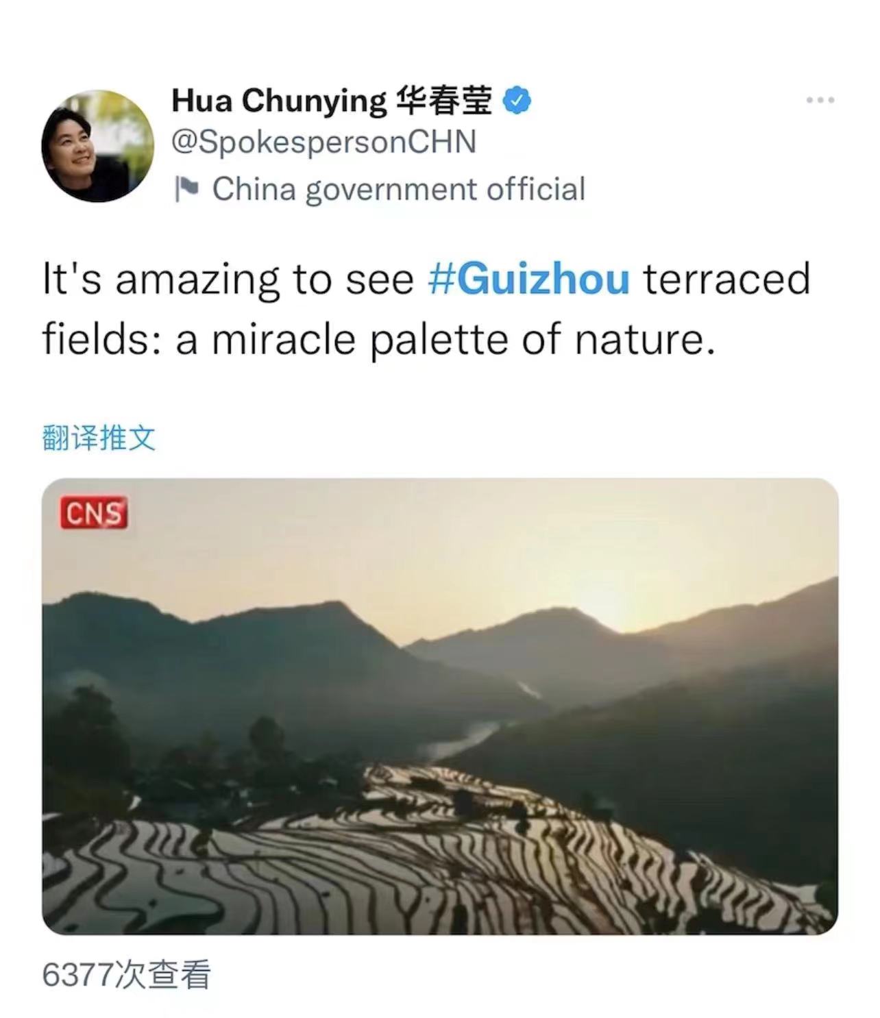 昨天,外交部发言人华春莹在她的推特账号上发布推文,惊叹贵州的梯田之美。