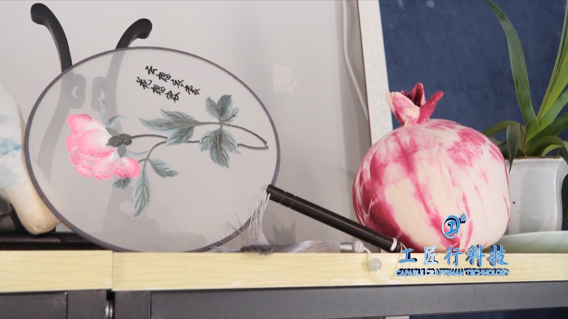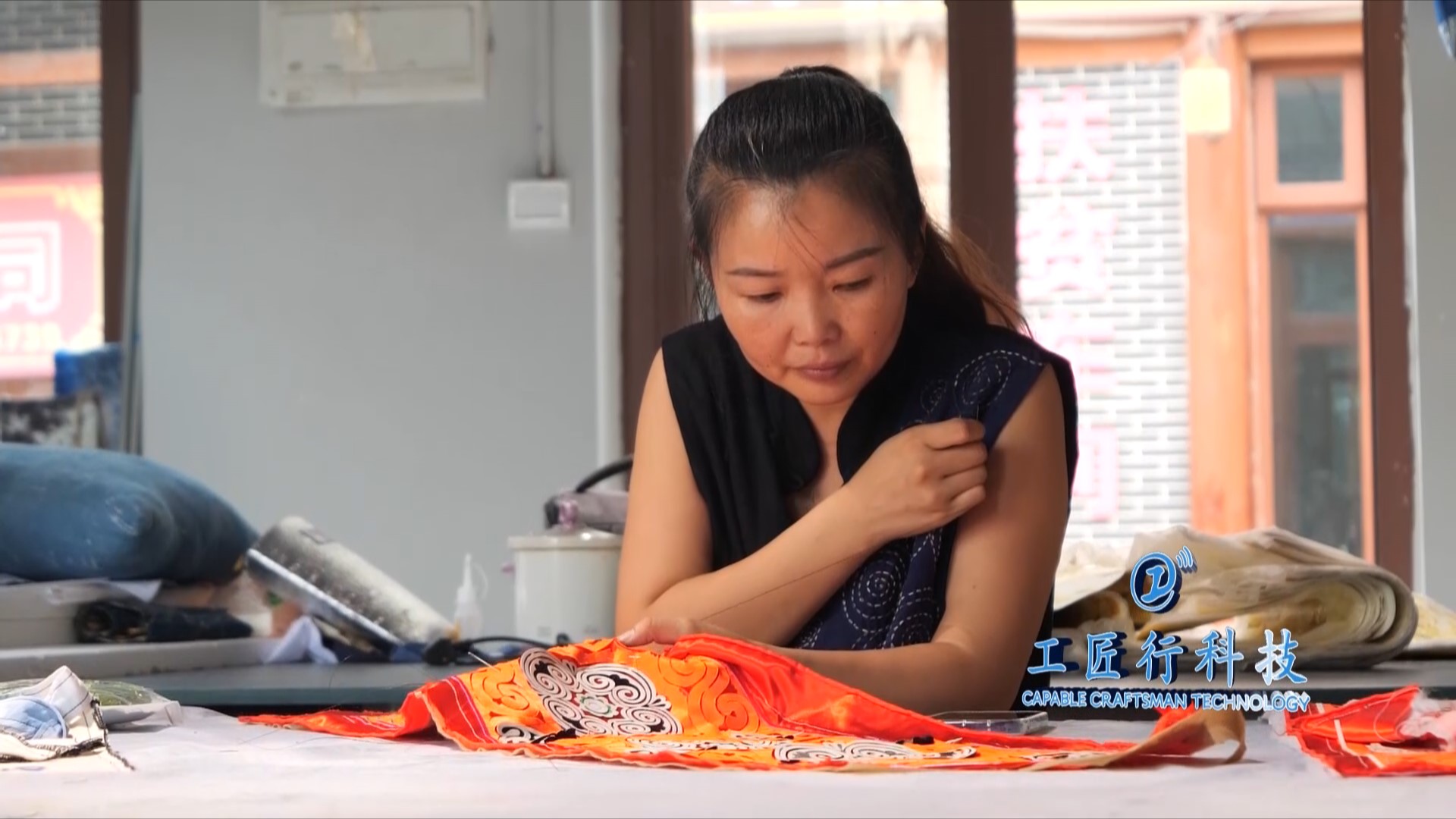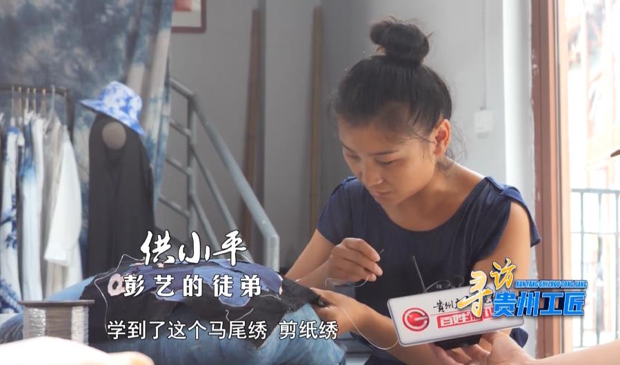 彭艺徒弟供小平:我来了三年了,学到了马尾绣,水绣,还有平绣。来这里的话,小孩偶尔还可以照顾到,因为我在这里挺自由的,每个月收入也还可以,反正看做的产品嘛,做多得多,做少得少。