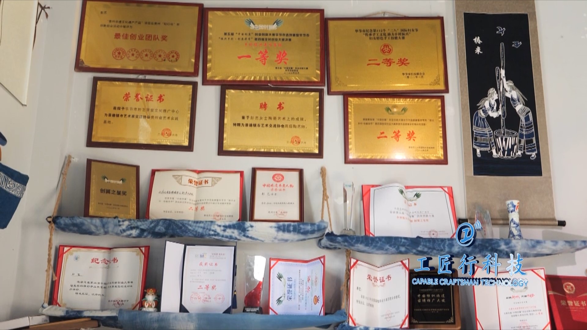 手艺人彭艺:这个是中国纺织非遗苗秀推广大使,是我2021年得的,这个奖项在当时只有11个还是12个,其中一个就是我。这个是基层服务卓越奖,全国的,是2022年的时候,我们贵州民族大学推荐我去申请的。