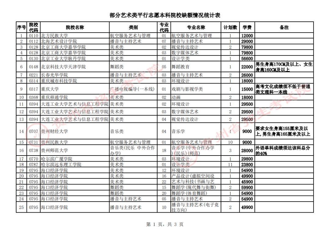 附:部分艺术类平行志愿本科院校缺额情况统计表