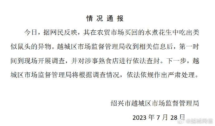 浙江省绍兴市越城区互联网信息办公室官方微博28日就“网友在农贸市场购买的水煮花生中吃出鼠头”一事发布情况通报,全文如下: