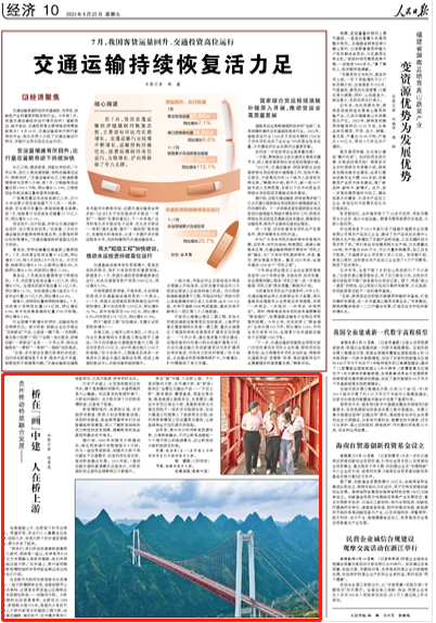 桥在“画”中建,人在桥上游。不只是坝陵河大桥,在平塘大桥,有“桥梁+服务区”全景区化融合产品——“天空之桥”,配有酒店、露营基地、观星台等设施,既是高速公路服务区,也是景区;建设中的花江峡谷大桥,是集桥梁观光与高空探险于一体的多功能综合体,在设计建造之初就嵌入了旅游观光功能,如利用桥塔横梁上空设置观光建筑,让游客获得全方位沉浸式的体验。
