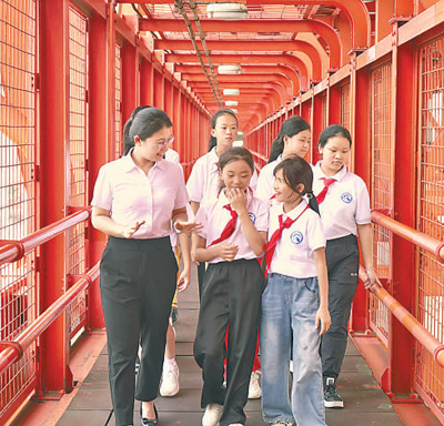 电梯缓缓上升,在桥面下的平台停住。带着好奇,学生们小心翼翼走出电梯,试探几步,发现大桥下的步道坚固稳当,便大步走了起来。