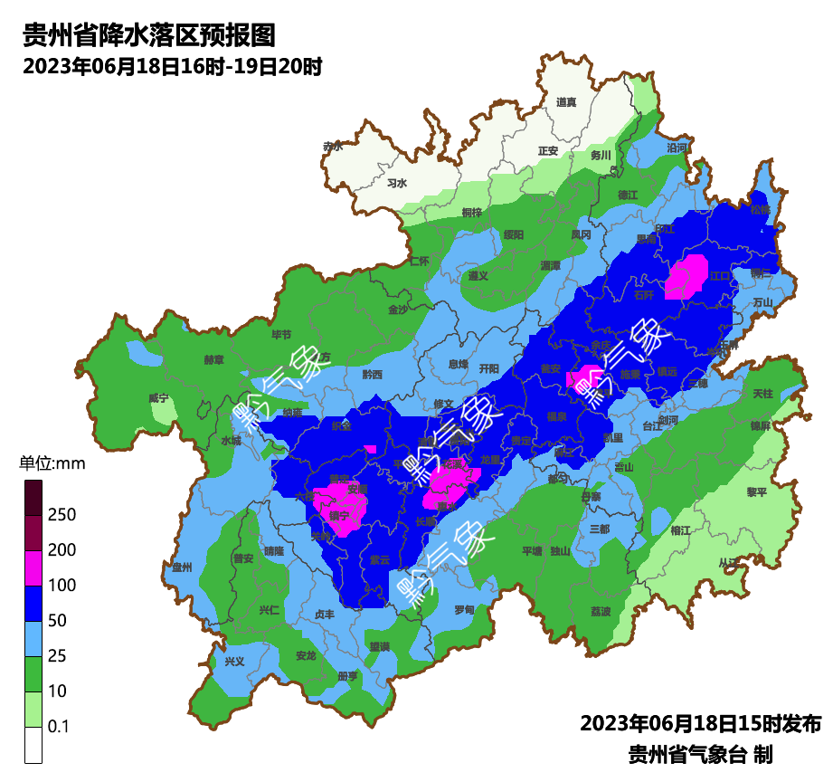根据贵州省气象台预报,今天(18日)傍晚到明天白天,毕节市东南部、遵义市东南部、铜仁市中南部、贵阳市大部、黔南州中北部、黔东南州西部和北部、安顺市、六盘水市东部、黔西南州东北部有大到暴雨,局部大暴雨,个别地区降雨量可达200毫米,上述部分地区伴有短时强降水(小时雨强 20-50 毫米,局地可超过 80 毫米),局地有雷暴大风等强对流天气。