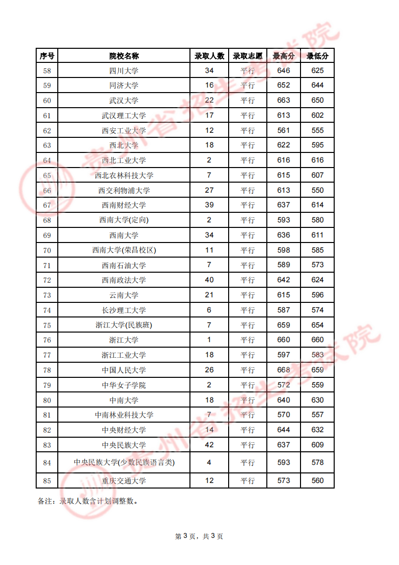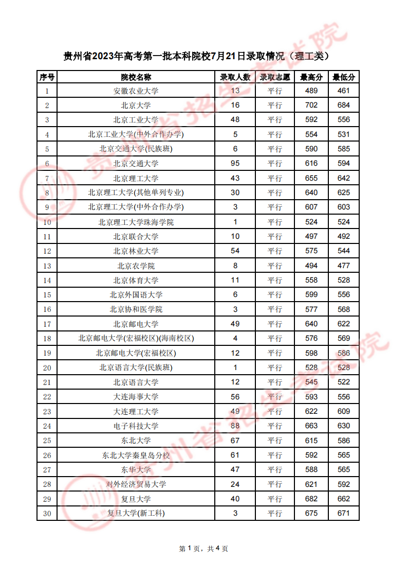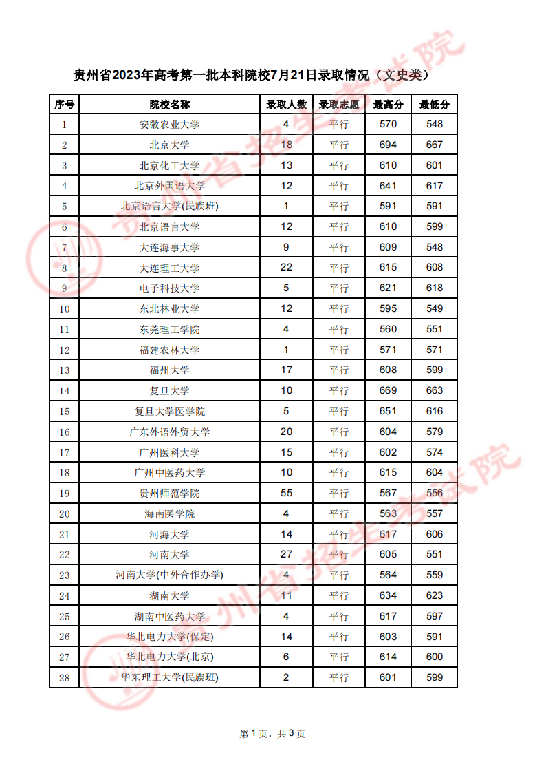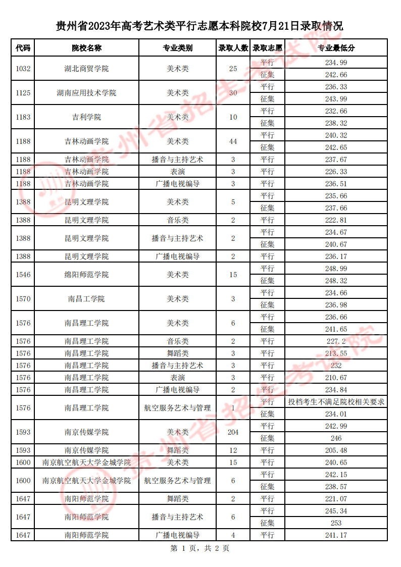 贵州省2023年高考第一批本科院校第2次征集志愿平行档情况