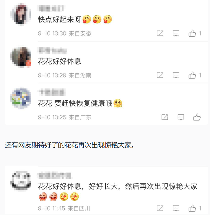 对于生病了的花花,网友们纷纷送上祝福,希望它好好休息,赶紧恢复健康。
