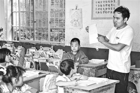 岩脚教学点是贵州省黔南布依族苗族自治州贵定县沿山镇的一所“微小学”,本学期有28名学前班孩子和6名一年级学生,陆成文是这个教学点唯一的在编教师。11年来,他默默坚守在此,在偏远农村教育一线奉献着自己的青春力量。图为陆成文在写字课上展示一年级学生的书法作品。