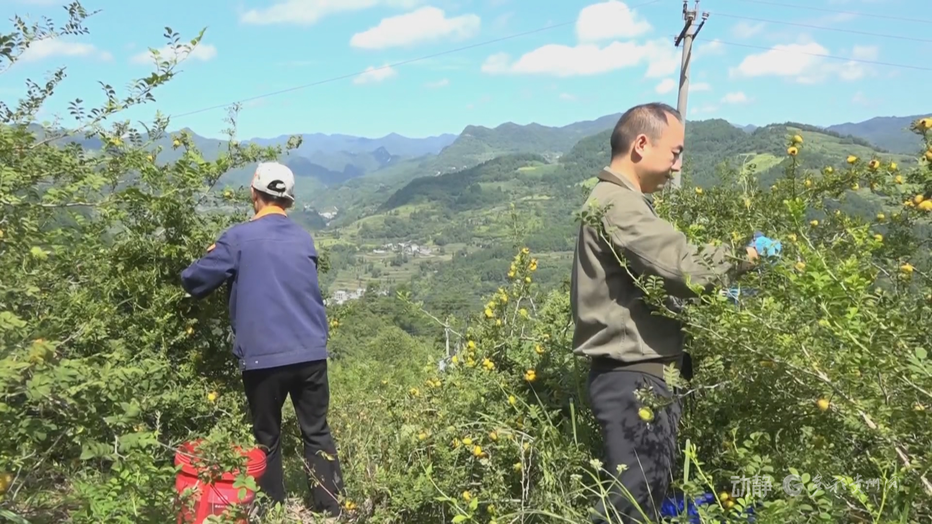 在遵义市桐梓县楚米镇的刺梨种植基地,果农们正忙着采摘成熟的刺梨果。近年来,当地立足本地资源优势,通过“党支部+企业+合作社+农户”的利益联结机制,带动60户农户种植刺梨。