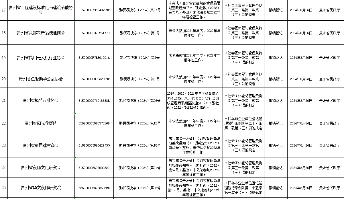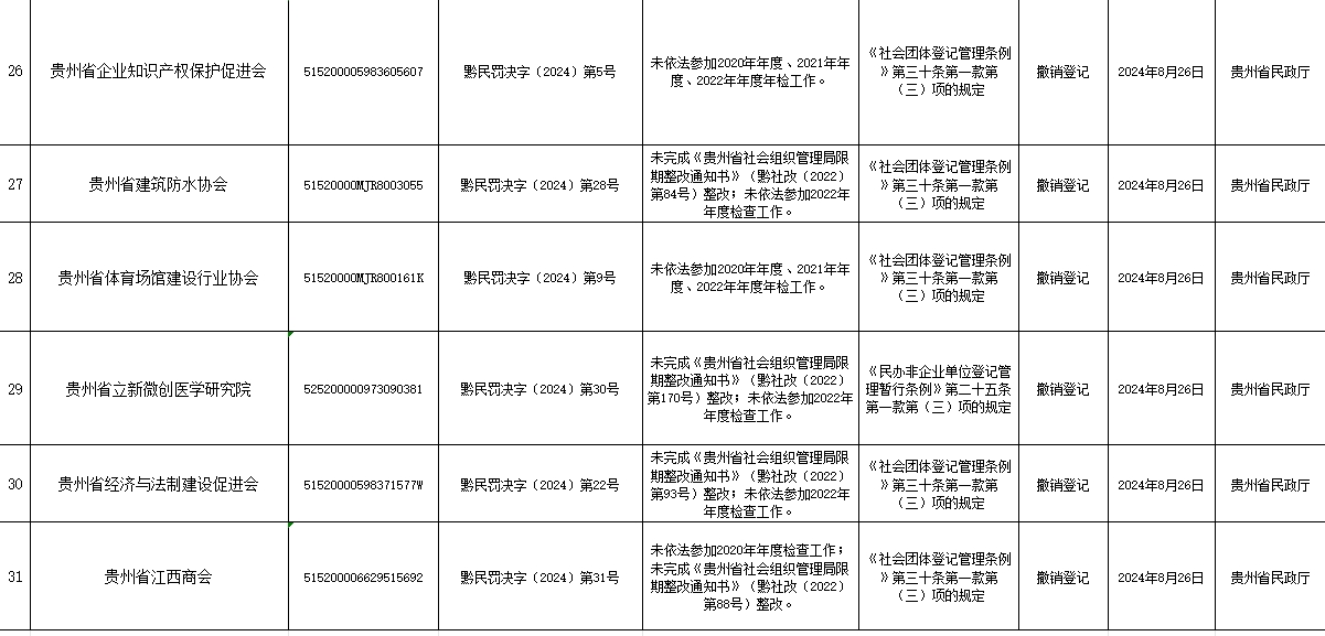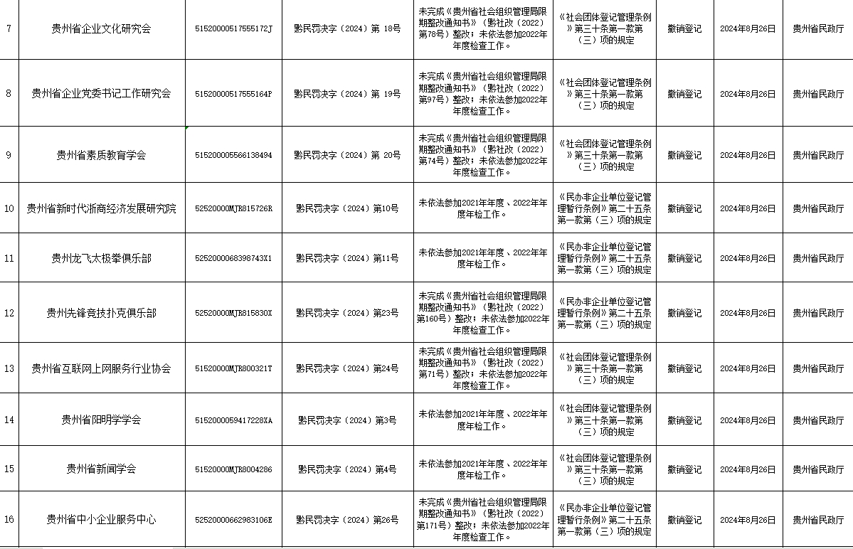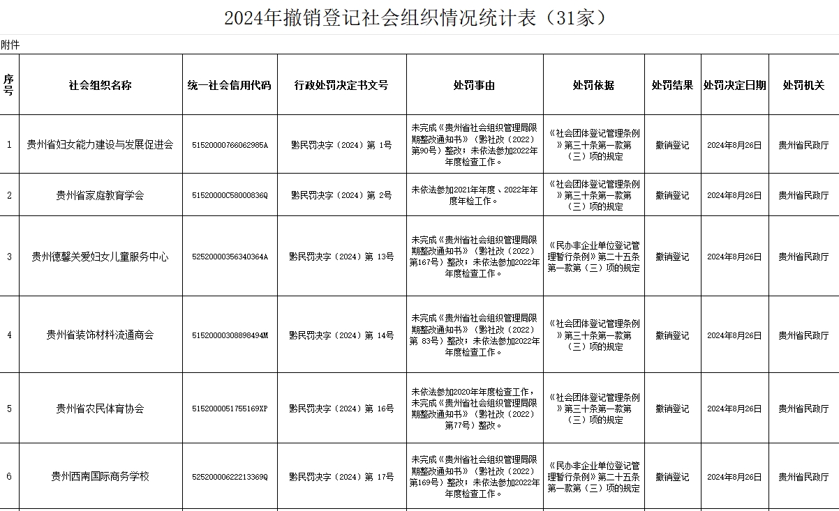 被撤销登记的社会组织名单:贵州省妇女能力建设与发展促进会、贵州省家庭教育学会、贵州德馨关爱妇女儿童服务中心、贵州省装饰材料流通商会、贵州省农民体育协会、贵州西南国际商务学校、贵州省企业文化研究会、贵州省企业党委书记工作研究会、贵州省素质教育学会、贵州省新时代浙商经济发展研究院、贵州龙飞太极拳俱乐部、贵州先锋竞技扑克俱乐部、贵州省互联网上网服务行业协会、贵州省阳明学学会、贵州省新闻学会、贵州省中小企业服务中心、贵州省工程建设标准化与建筑节能协会、贵州省爽都农产品流通商会、贵州省民用无人机行业协会、贵州省仁爱助学公益协会、贵州省模特行业协会、贵州省阳光救援队、贵州省家居建材商会、贵州省夜郎文化研究会、贵州省华文夜郎研究院、贵州省企业知识产权保护促进会、贵州省建筑防水协会、贵州省体育场馆建设行业协会、贵州省立新微创医学研究院、贵州省经济与法制建设促进会、贵州省江西商会