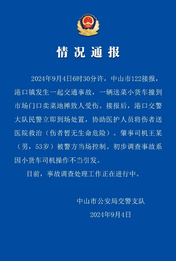 中新网9月4日电 据中山市公安局交通警察支队微信公众号消息,广东省中山市公安局交警支队4日发布情况通报称,2024年9月4日6时30分许,中山市122接报,港口镇发生一起交通事故,一辆送菜小货车撞到市场门口卖菜地摊致人受伤。接报后,港口交警大队民警立即到场处置,协助医护人员将伤者送医院救治(伤者暂无生命危险)。肇事司机王某(男,53岁)被警方当场控制。初步调查事故系因小货车司机操作不当引发。