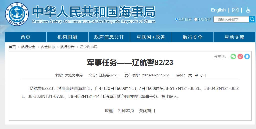 据中国海事局网站消息,大连海事局发布航行警告,自4月30日16时至5月7日16时,渤海海峡黄海北部执行军事任务,禁止驶入。
