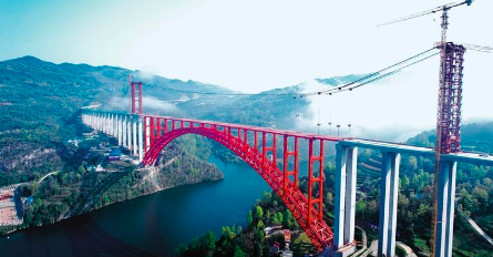 3月30日拍摄的贵州德余高速乌江特大桥。当日,随着一节重达180余吨的桥面梁精准就位,德(江)余(庆)高速公路乌江特大桥钢结构施工全面完成,大桥主体贯通。大桥位于遵义市凤冈县、铜仁市思南县和石阡县的交界处,全长1834米,主跨504米,是目前世界最大跨径的上承式钢管混凝土拱桥。刘叶林摄(中经视觉)