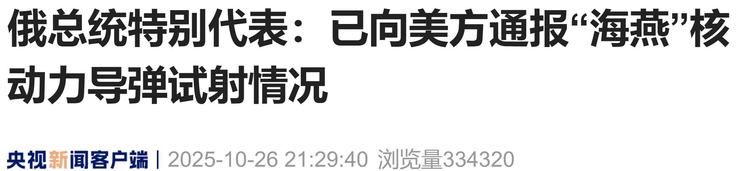 当地时间10月26日,俄罗斯总统特别代表基里尔·德米特里耶夫表示,美国方面已得到了有关俄成功试射“海燕”核动力巡航导弹的信息通报。