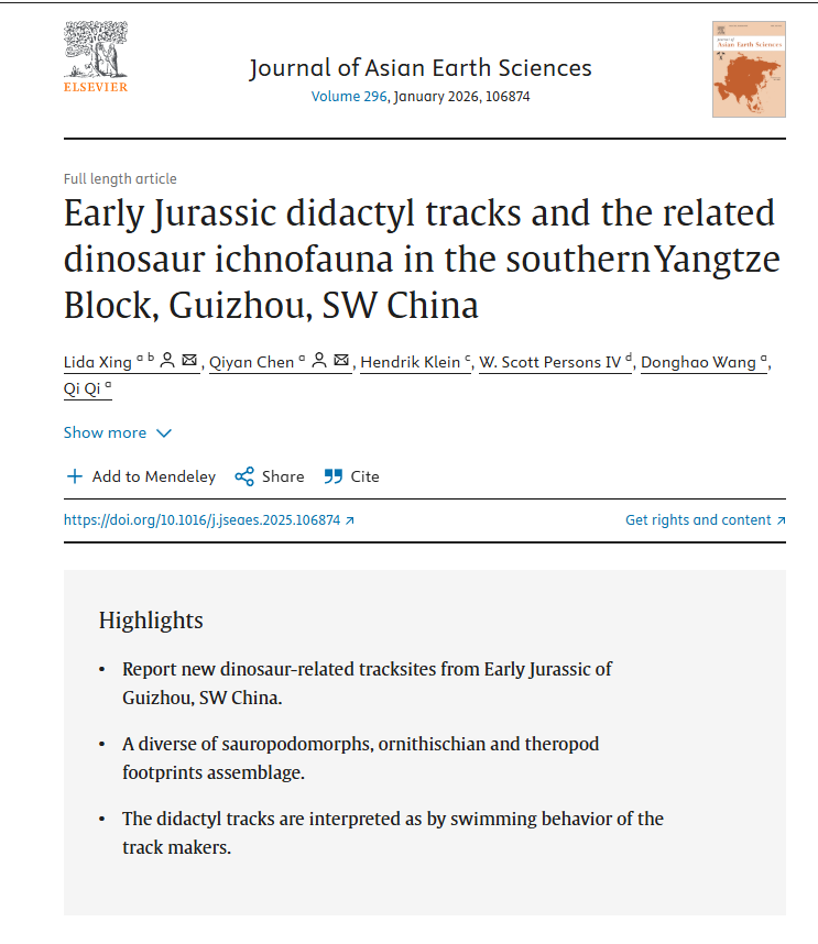 由中国、德国、美国等多国科学家组成的研究团队,近日在国际学术期刊《亚洲地球科学杂志》上发表研究成果,该成果通过研究遵义市仁怀市大坝镇五岔村发现的一批保存良好的恐龙足迹化石,鉴定其为蜥脚类、兽脚类等恐龙的足迹组合,反映出当地在侏罗纪早期为湖岸沙坝环境,适合多类群恐龙活动。此次新发现丰富了贵州早侏罗世恐龙动物群的研究。随着更多足迹点被勘查,仁怀地区有望成为研究中国早侏罗世恐龙活动的重要窗口。