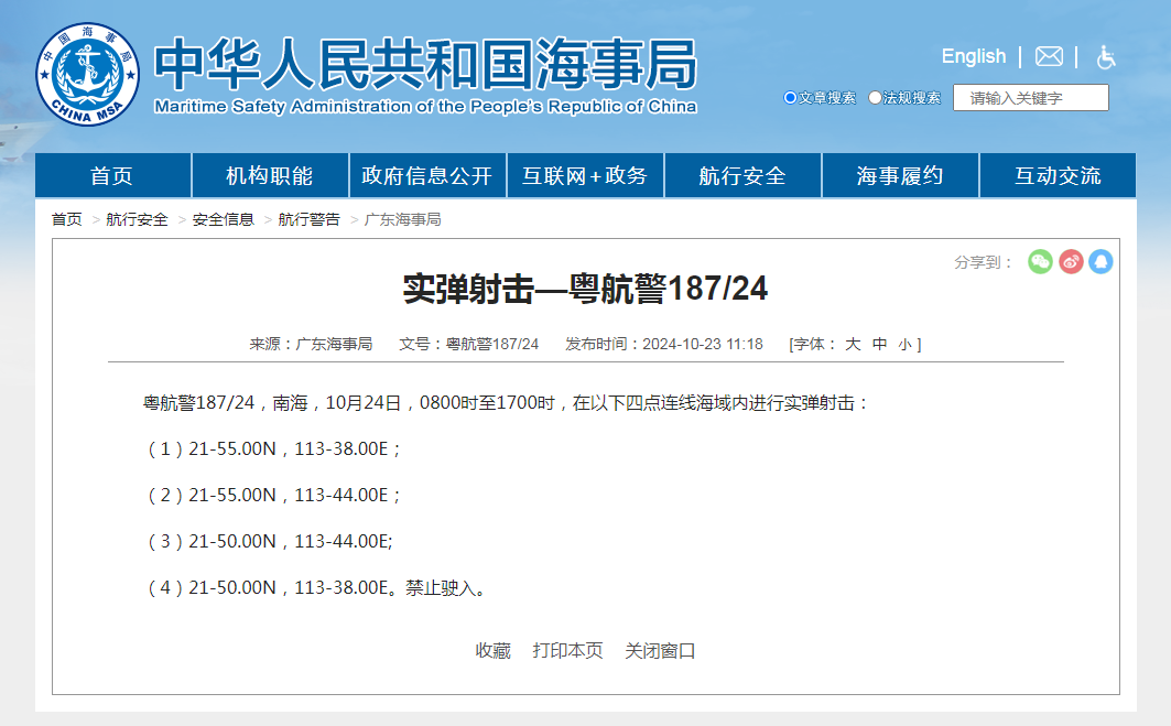据中国海事局网站消息,广东海事局发布航行警告,10月24日8时至17时,南海部分海域进行实弹射击,禁止驶入。