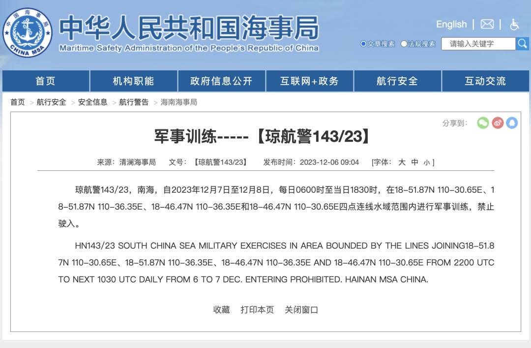 清澜海事局12月6日发布航行警告:南海,自2023年12月7日至12月8日,每日6时至当日18时30分,在18-51.87N 110-30.65E、18-51.87N 110-36.35E、18-46.47N 110-36.35E和18-46.47N 110-30.65E四点连线水域范围内进行军事训练,禁止驶入。