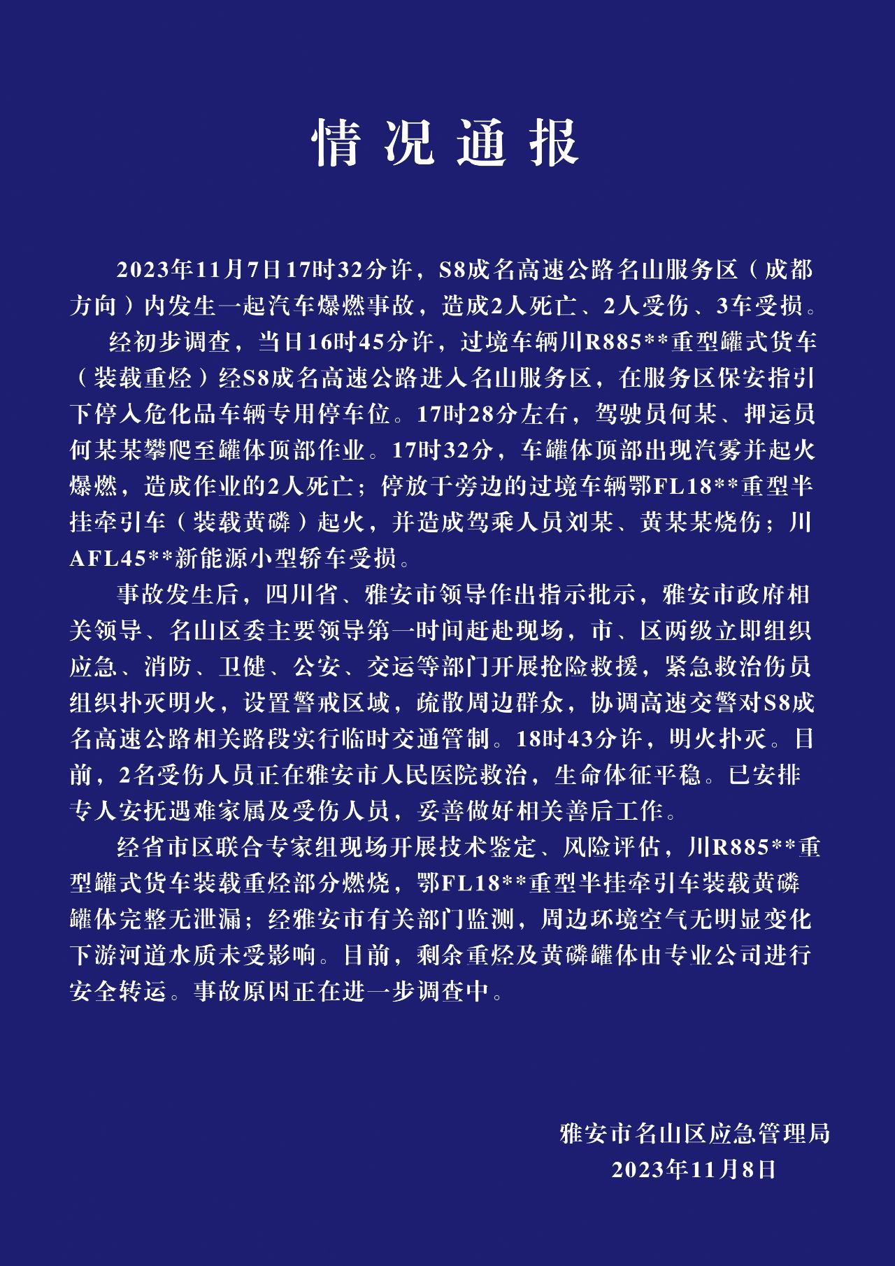 经初步调查,当日16时45分许,过境车辆川R885**重型罐式货车(装载重烃)经S8成名高速公路进入名山服务区,在服务区保安指引下停入危化品车辆专用停车位。17时28分左右,驾驶员何某、押运员何某某攀爬至罐体顶部作业。17时32分,车罐体顶部出现气雾并起火爆燃,造成作业的2人死亡;停放于旁边的过境车辆鄂FL18**重型半挂牵引车(装载黄磷)起火,并造成驾乘人员刘某、黄某某烧伤;川AFL45**新能源小型轿车受损。事故发生后,雅安市、名山区两级政府部门立即组织应急、消防、卫健、公安、交运等部门开展抢险救援,协调高速交警对S8成名高速公路相关路段实行临时交通管制。18时43分许,明火扑灭。目前,2名受伤人员正在雅安市人民医院救治。