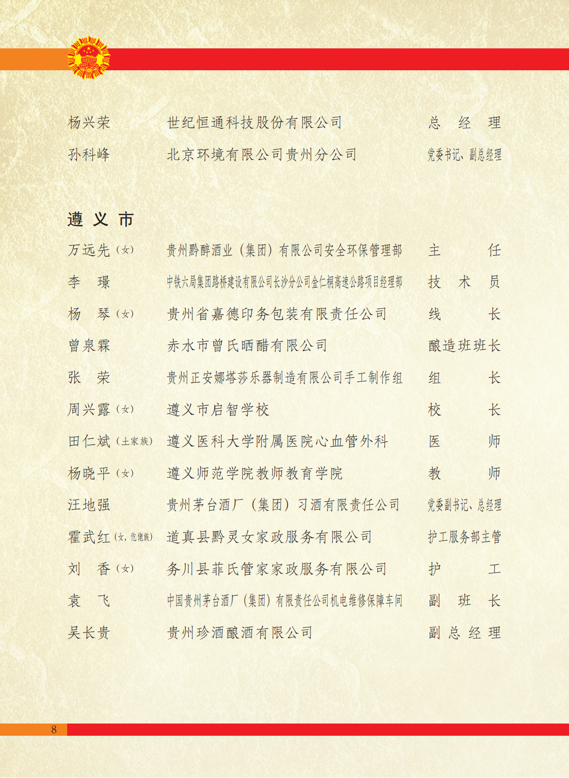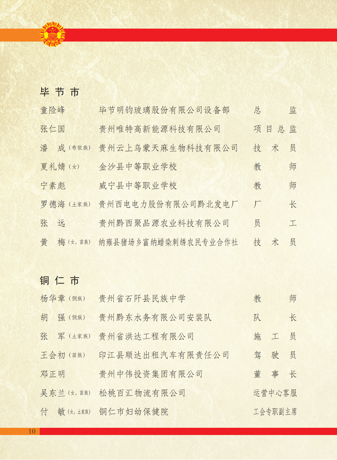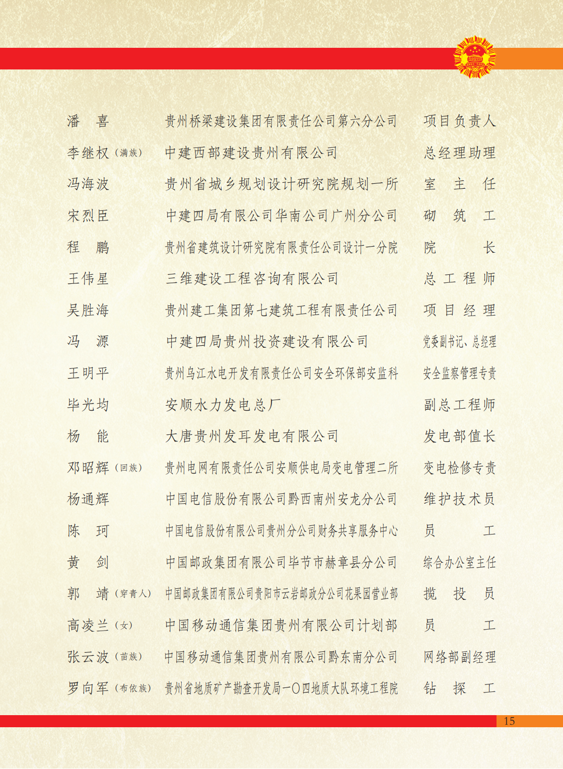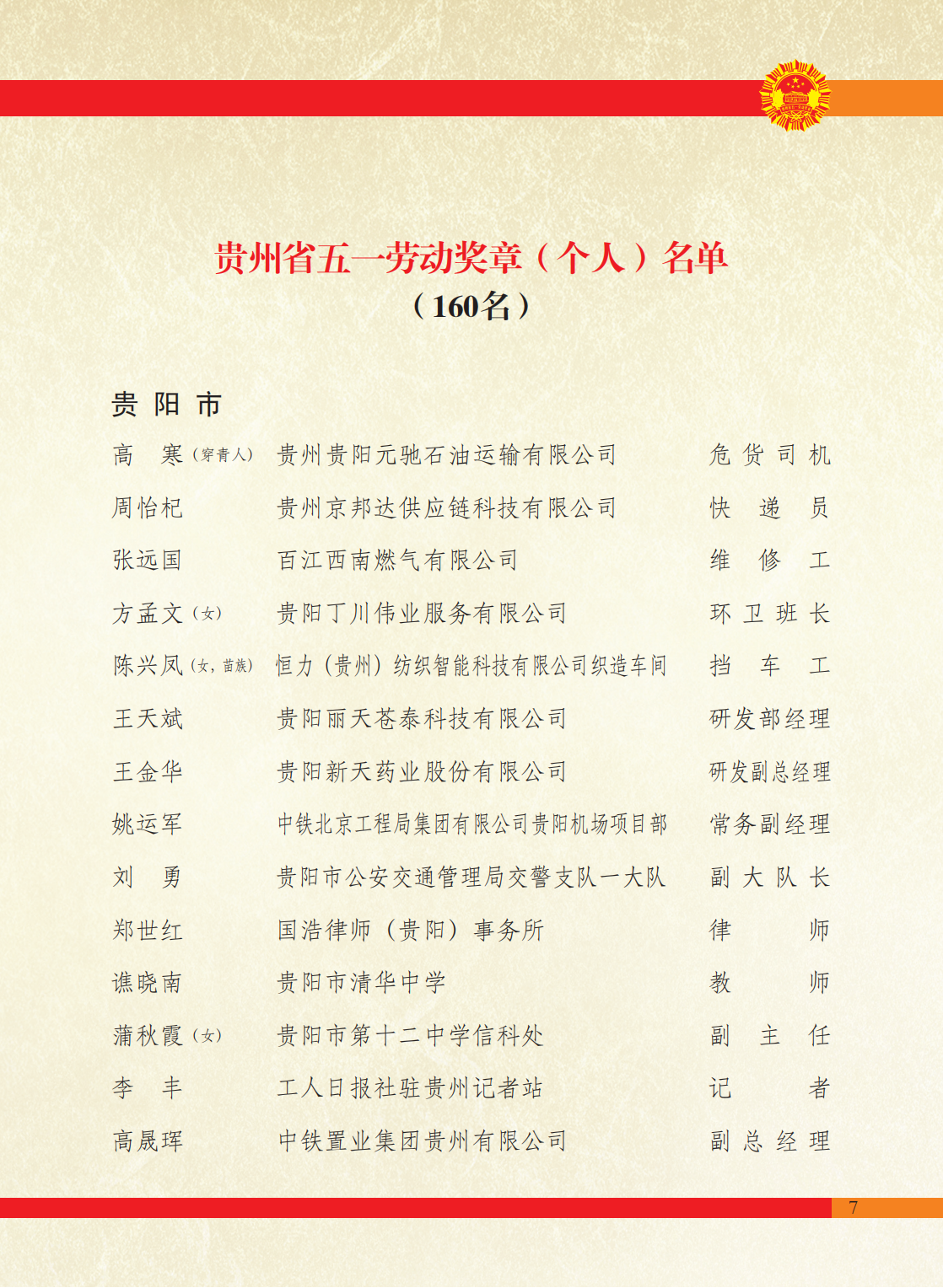 在50个“贵州省五一劳动奖状”中,非公有制经济组织21个,占比41.1%;在160名“贵州省五一劳动奖章”中,产业工人67名,占比41.87%,其它一线职工或专业技术人员38名,占比23.75%,科教人员32名,占比20%;职称方面,高级工及中级以上专业职称人数达102名,占总数的63.75%。