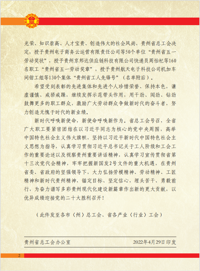 今天(4月29日)上午,贵州省庆祝“五一”国际劳动节暨表彰大会在贵阳举行。贵州省总工会决定,授予贵州电子商务云运营有限责任公司等50个单位“贵州省五一劳动奖状”,授予贵州京邦达供应链科技有限公司快递员周怡杞等160名职工“贵州省五一劳动奖章”,授予贵州航天电子科技公司机加车间钳工组等130个集体“贵州省工人先锋号”。