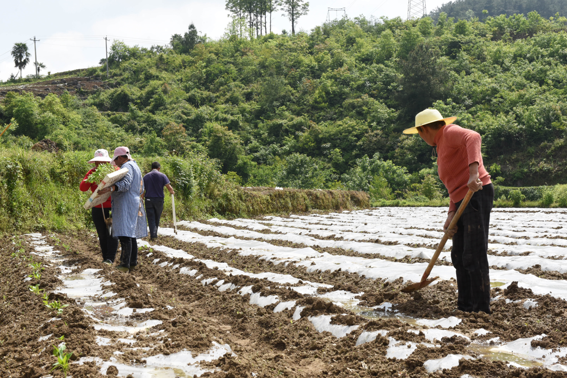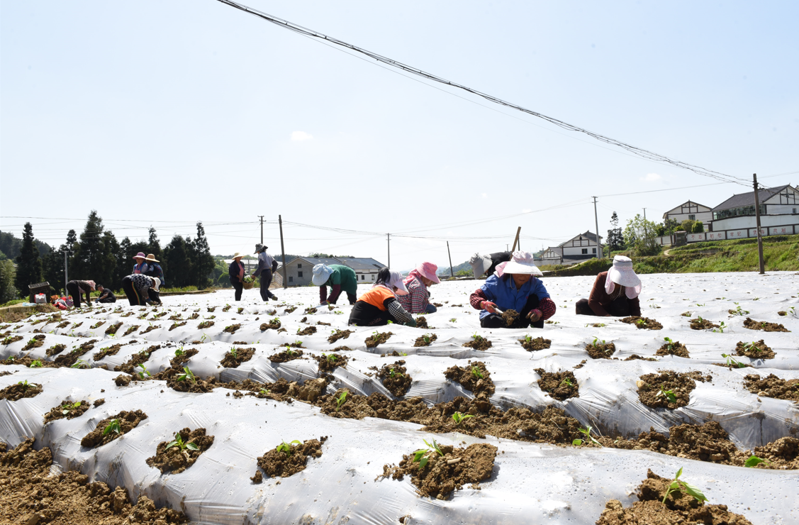 在播州区乐山镇浒洋水村辣椒种植基地,种植大户马礼明趁着当前的晴好天气,正带着工人移栽辣椒苗。
