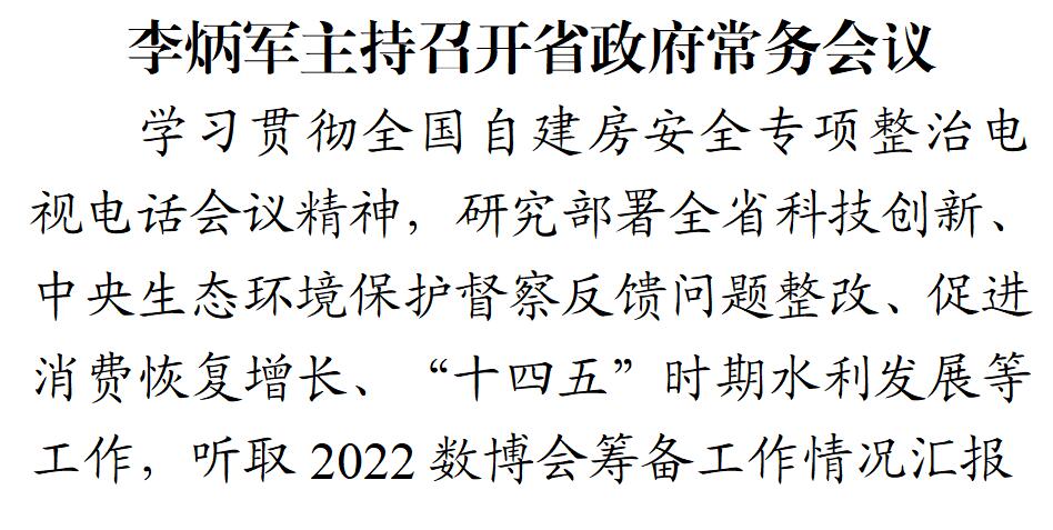 5月12日,省委副书记、省长李炳军主持召开省政府常务会议,学习贯彻全国自建房安全专项整治电视电话会议精神,研究部署全省科技创新、中央生态环境保护督察反馈问题整改、促进消费恢复增长、“十四五”时期水利发展等工作,听取2022数博会筹备工作情况汇报。